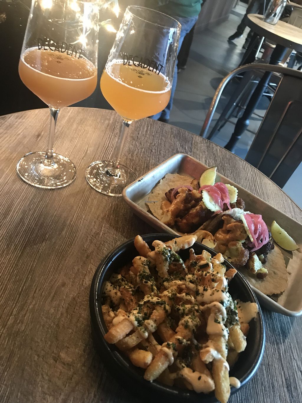 Decadent ales is a fun, hip place to grab drinks and food with friends. Hapa which makes the Hawaiian inspired food has lots of vegan options considering how small the menu is. Not everything that is vegan or can be made vegan is marked on the menu. We got the crunchy Cauliflower tacos, impossible burger, charred Brussels and fries with vegan aoli (ask for them vegan). Everything was totally delicious! In my opinion the prices are a little high considering the portions and that it’s counter service but they’re not outrageous for the atmosphere and flavor. Overall I definitely plan to add this to my rotation of go to hangouts!