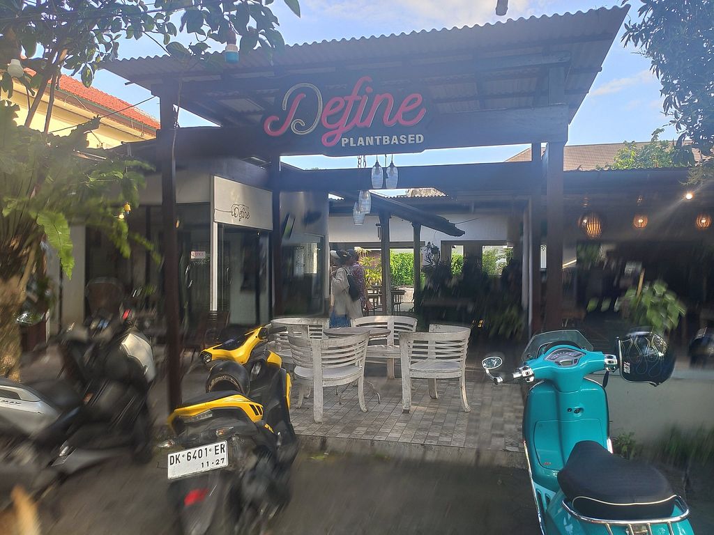 Define is conveniently near immigration services if you extending your visa. It has covered outdoor seating, and unfortunately slow service (even by Indonesia standards). The portions are pretty small so it can get pricey if you are hungry.