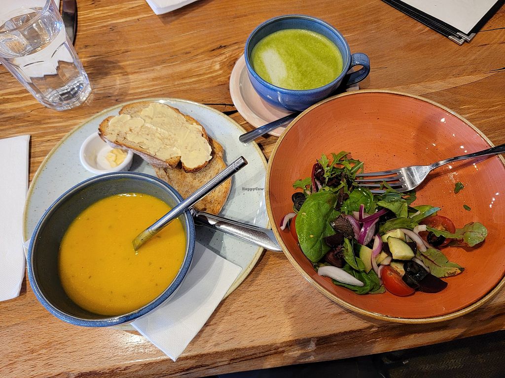 Very tasty vegan soup of the day (was broccoli) and vegan bagel served together with some salad and chips on the side. I had also a slice of the orange chocolate cake to finish and was delicious. Highly recommended!!😄