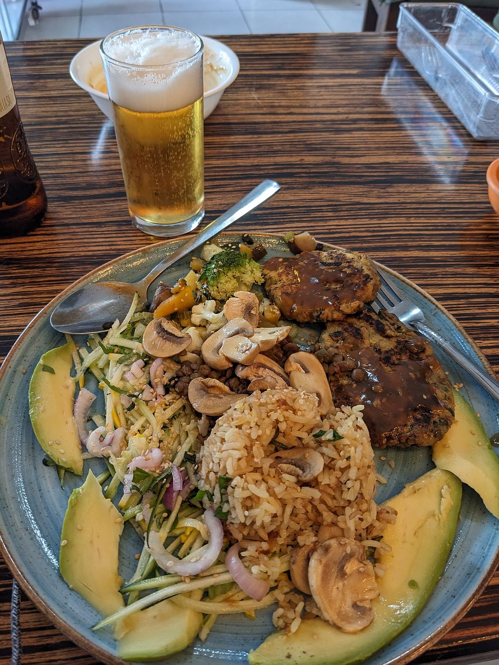 The meal came with lemonade and bean soup. La cerveza colombiana was a…