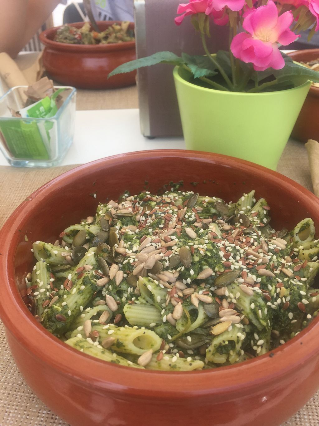 Raw noodles with pesto, hummus, bread and tomatoes (+ in the backgroun…