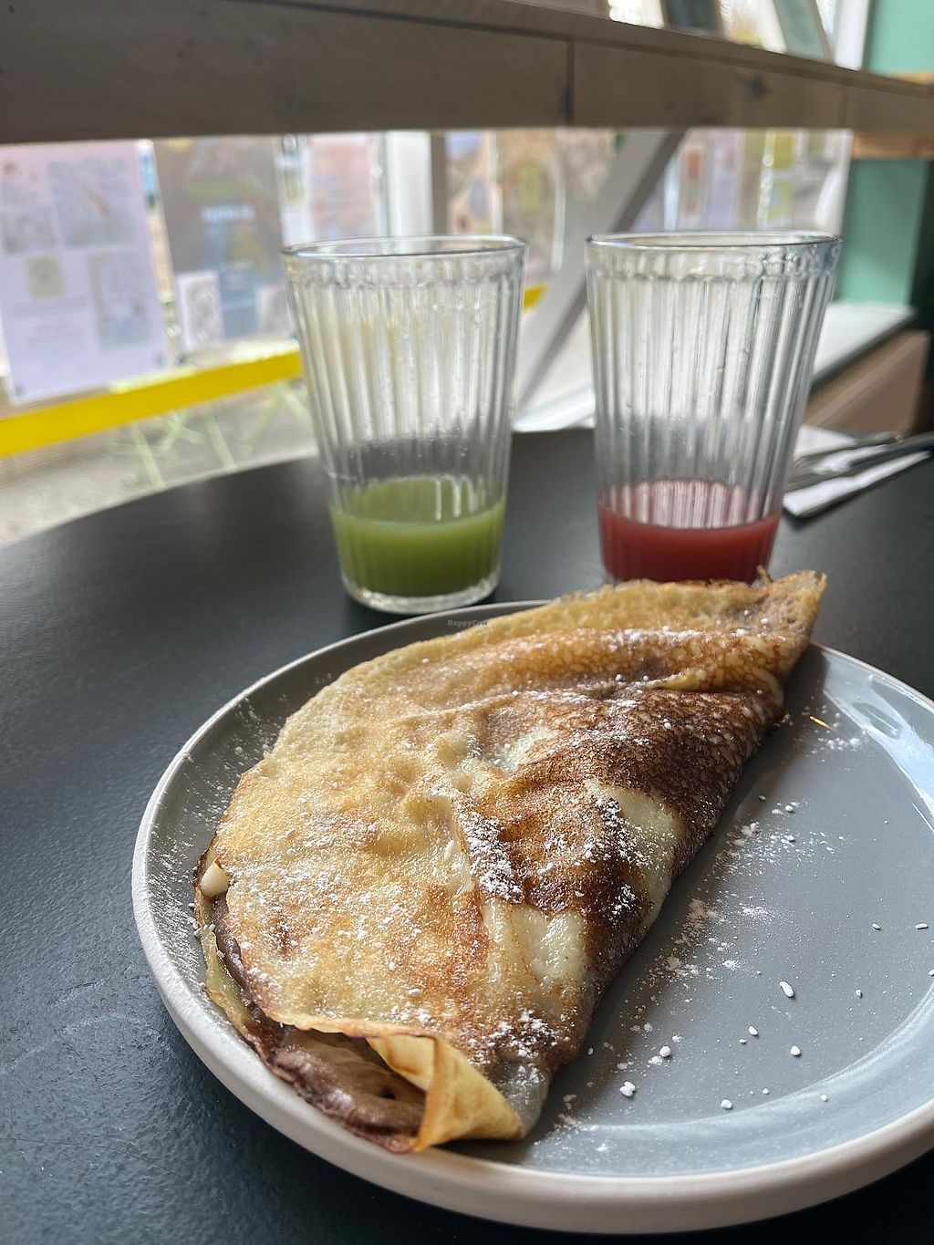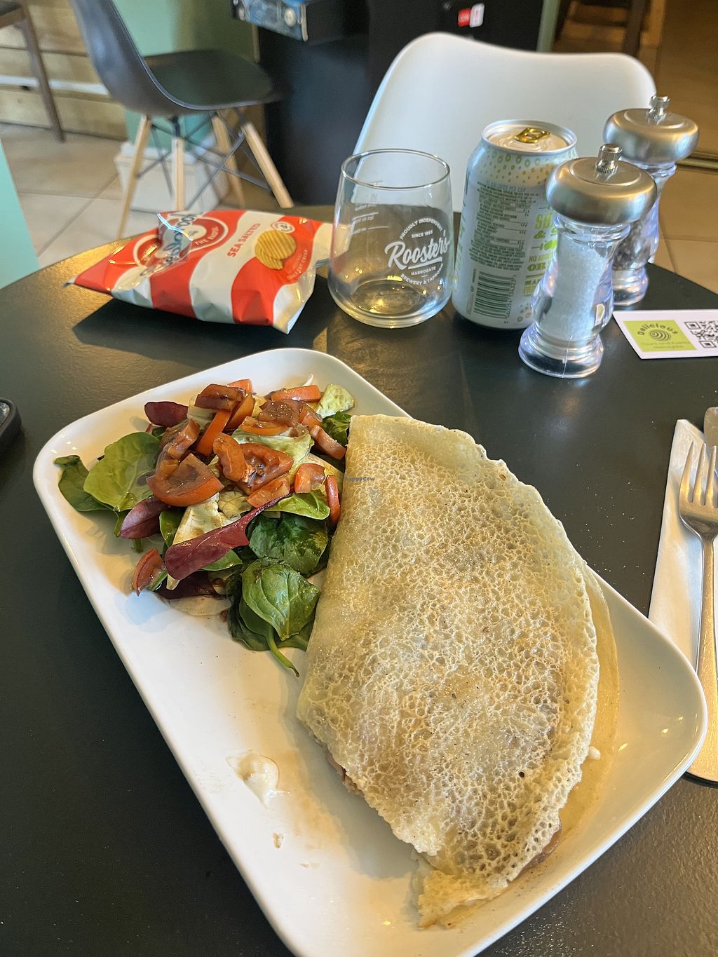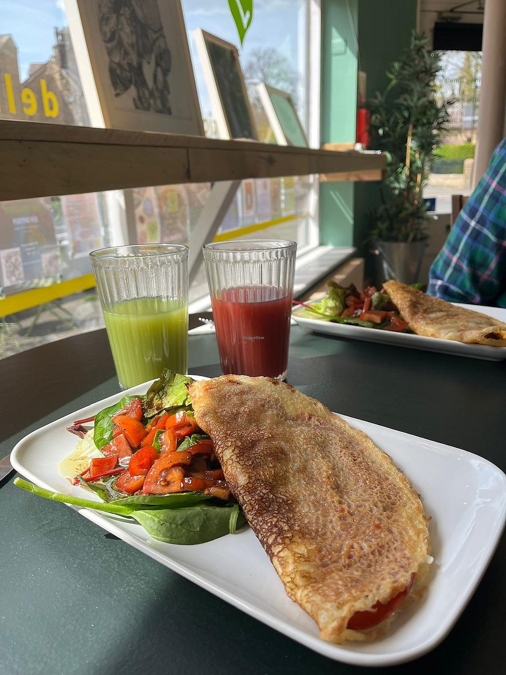 Curried carrots, peppers and vegan cheese savoury crepe.
