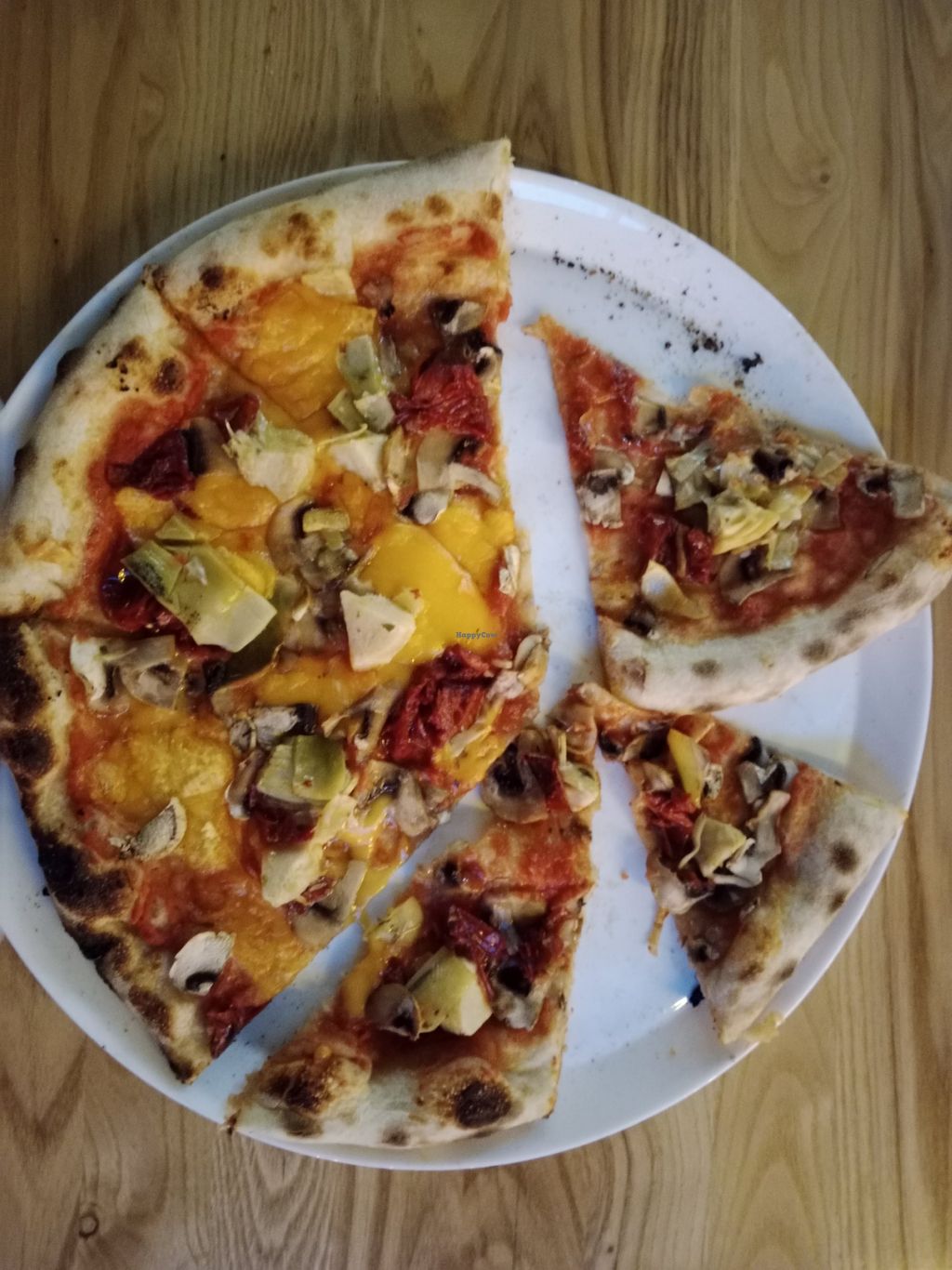 Vegan pizza tastes good. The ingredients are unusual - dried tomatoes and artichokes. Together with mushrooms they make a tasty composition.