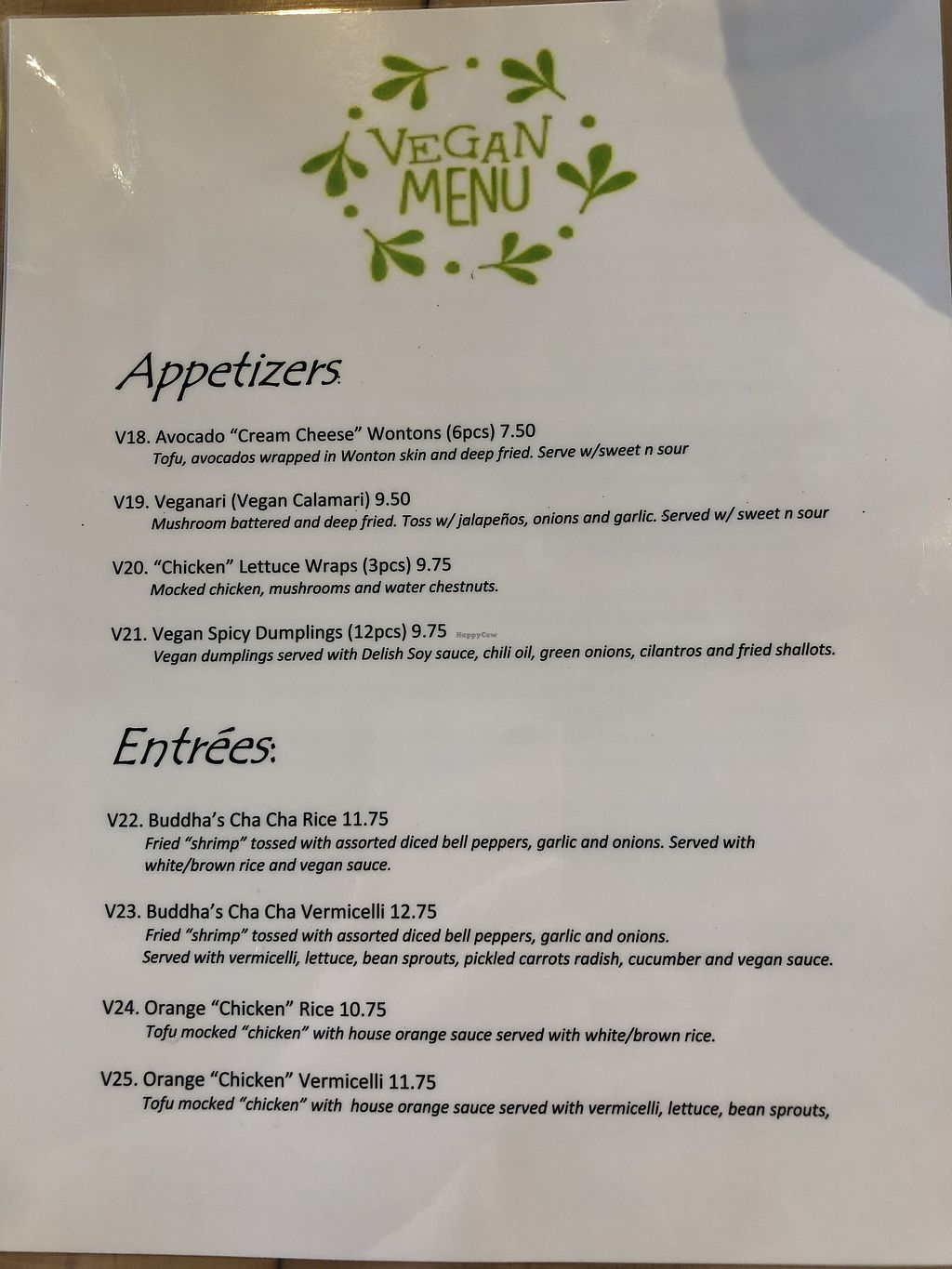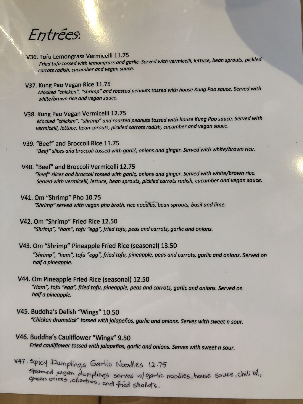 Delish vegan wings are tasty, smoky, & flavorful. I always order the Om fried rice. It had tofu and vegan ham. The vegan spicy dumplings and the monks dumplings are downright delectable.