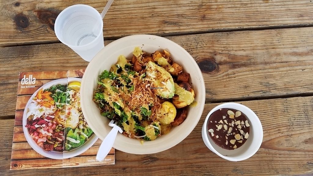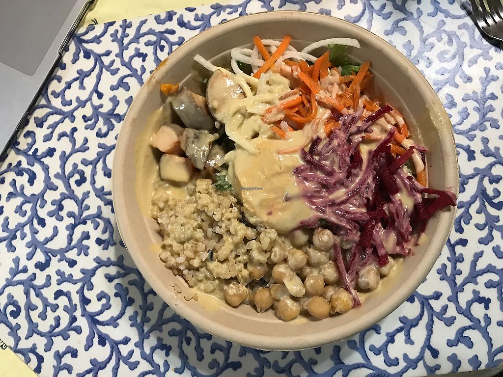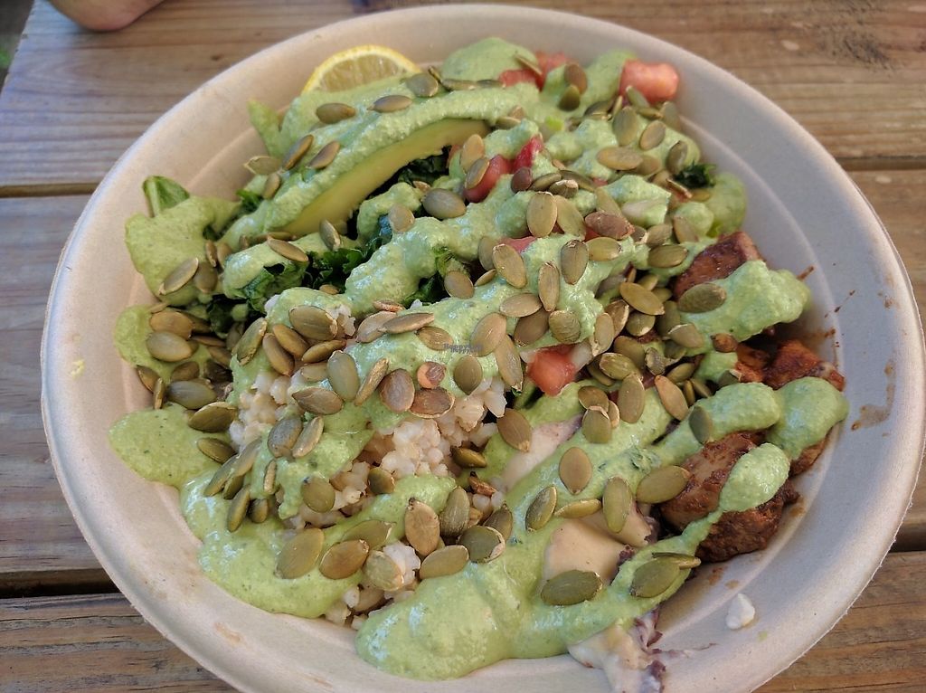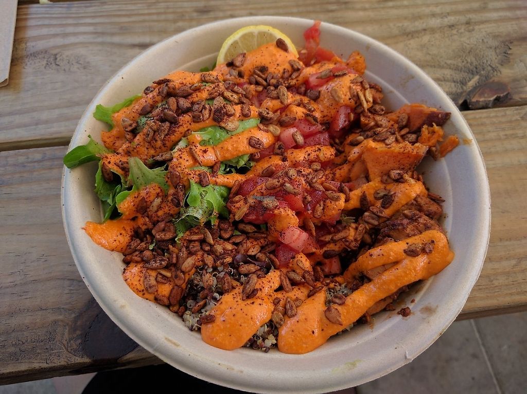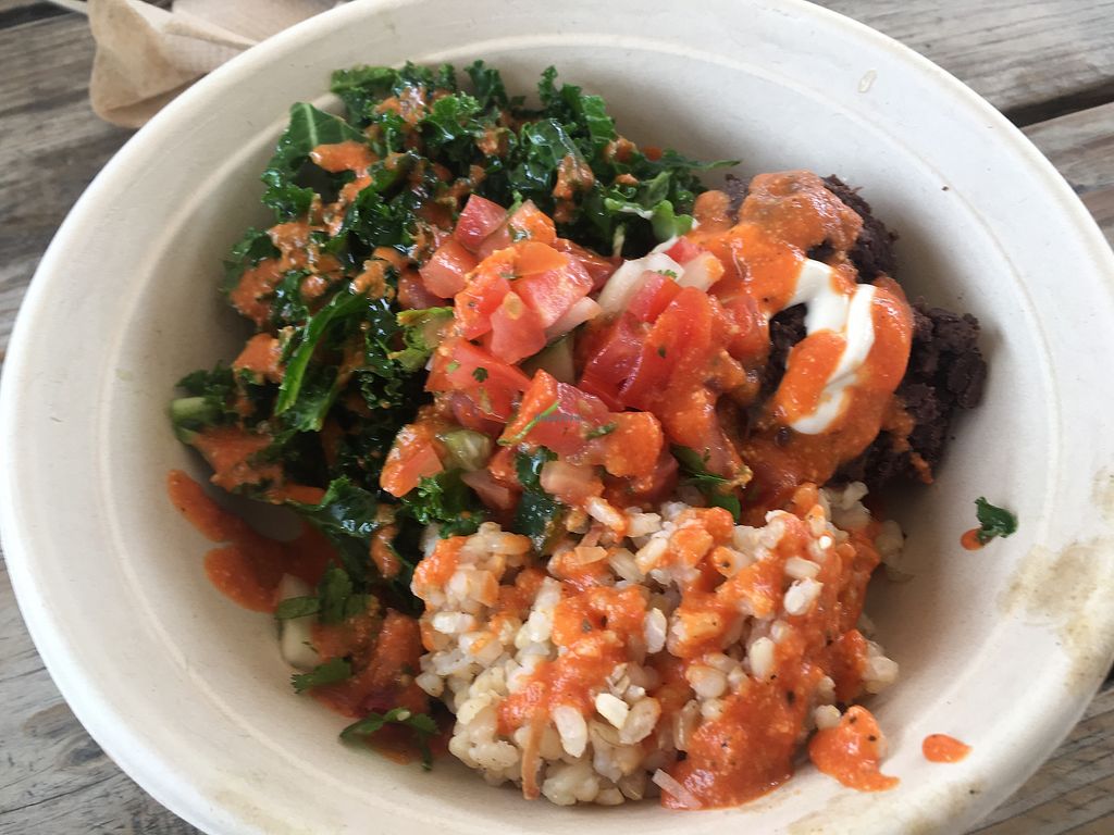Brown rice quinoa base, kale, sweet potatoes, lentil meatballs, toaste…