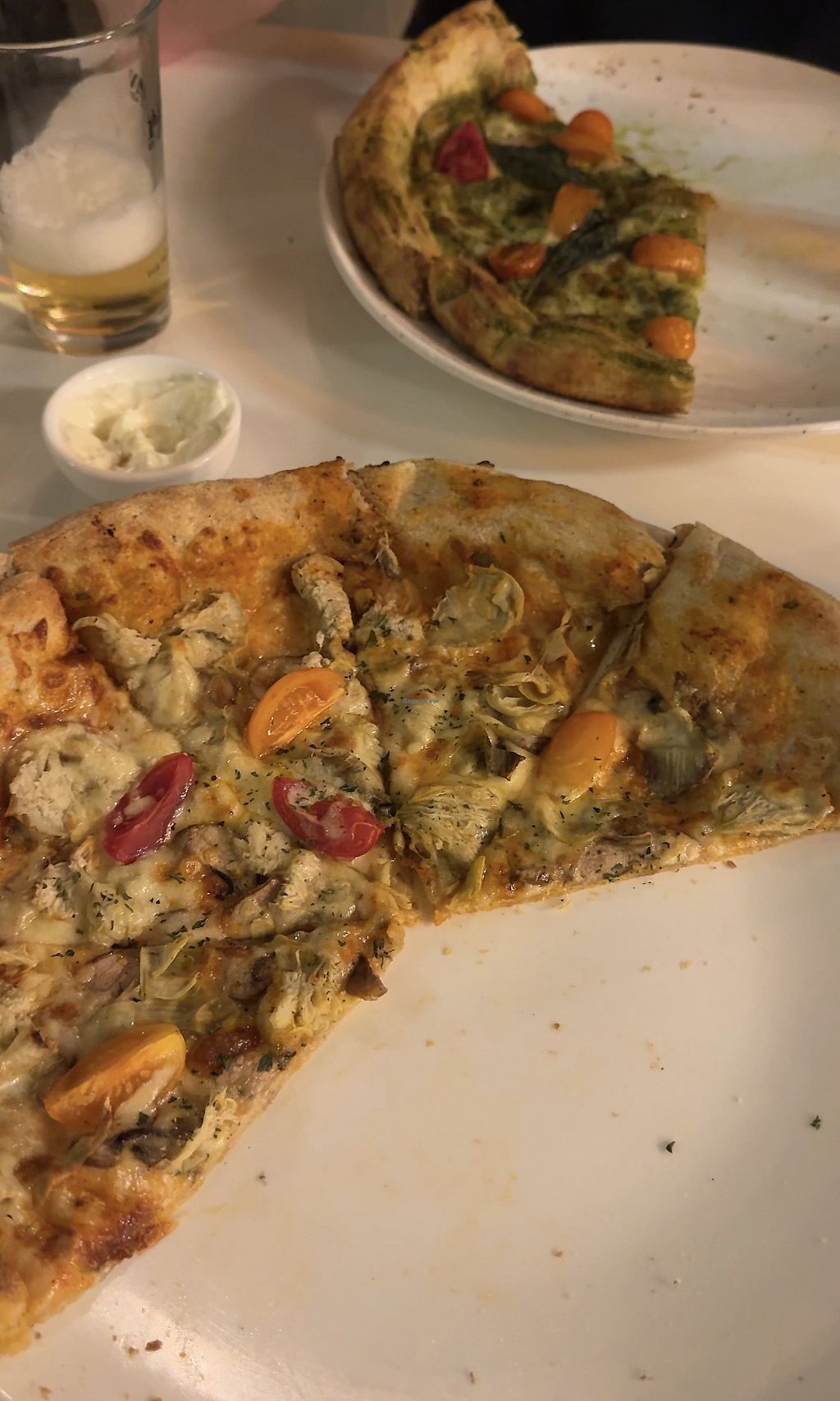 Artichoke tomato & mushroom pizza, and a tomato & basil pizza