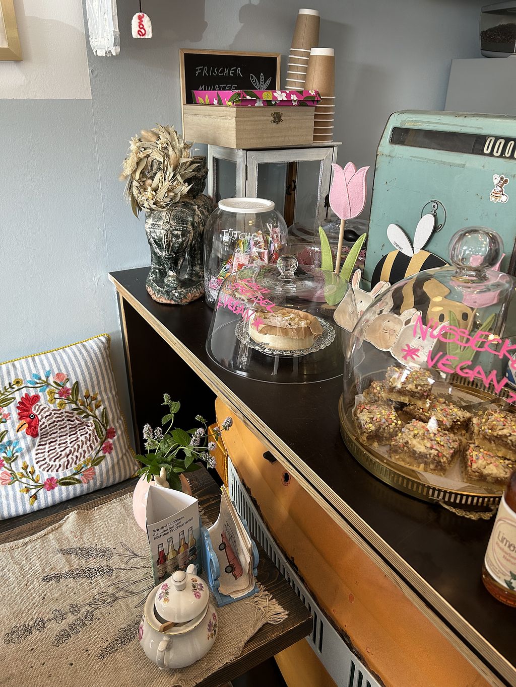 Lemon and coconut tarte, poppy seed cake (background) and latte macchi…
