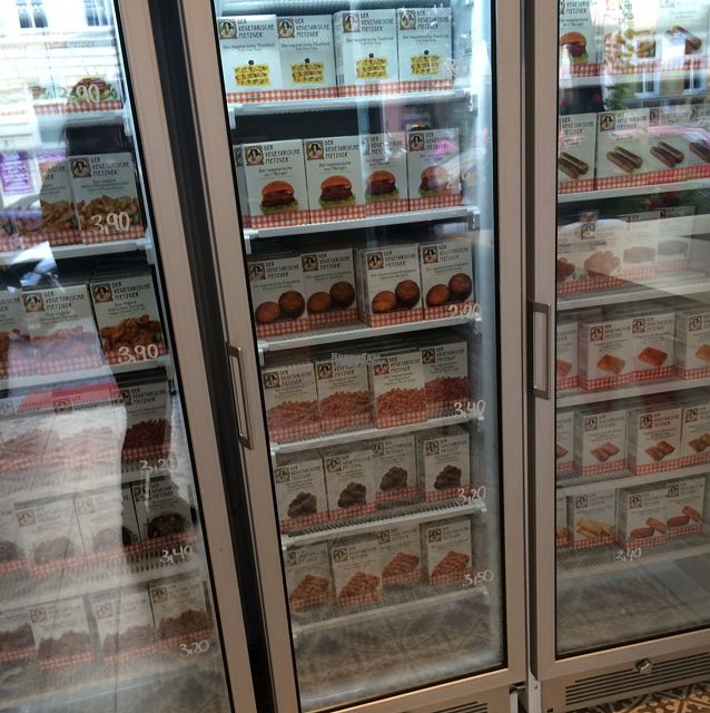 The Vegetarian Butcher shop is from the Netherlands. This Berlin outlet opened Sep 2016. Offers takeaway faux meat snacks and sells frozen food like faux chicken and meatballs. Has a small seating area. Reported closed, June '20.