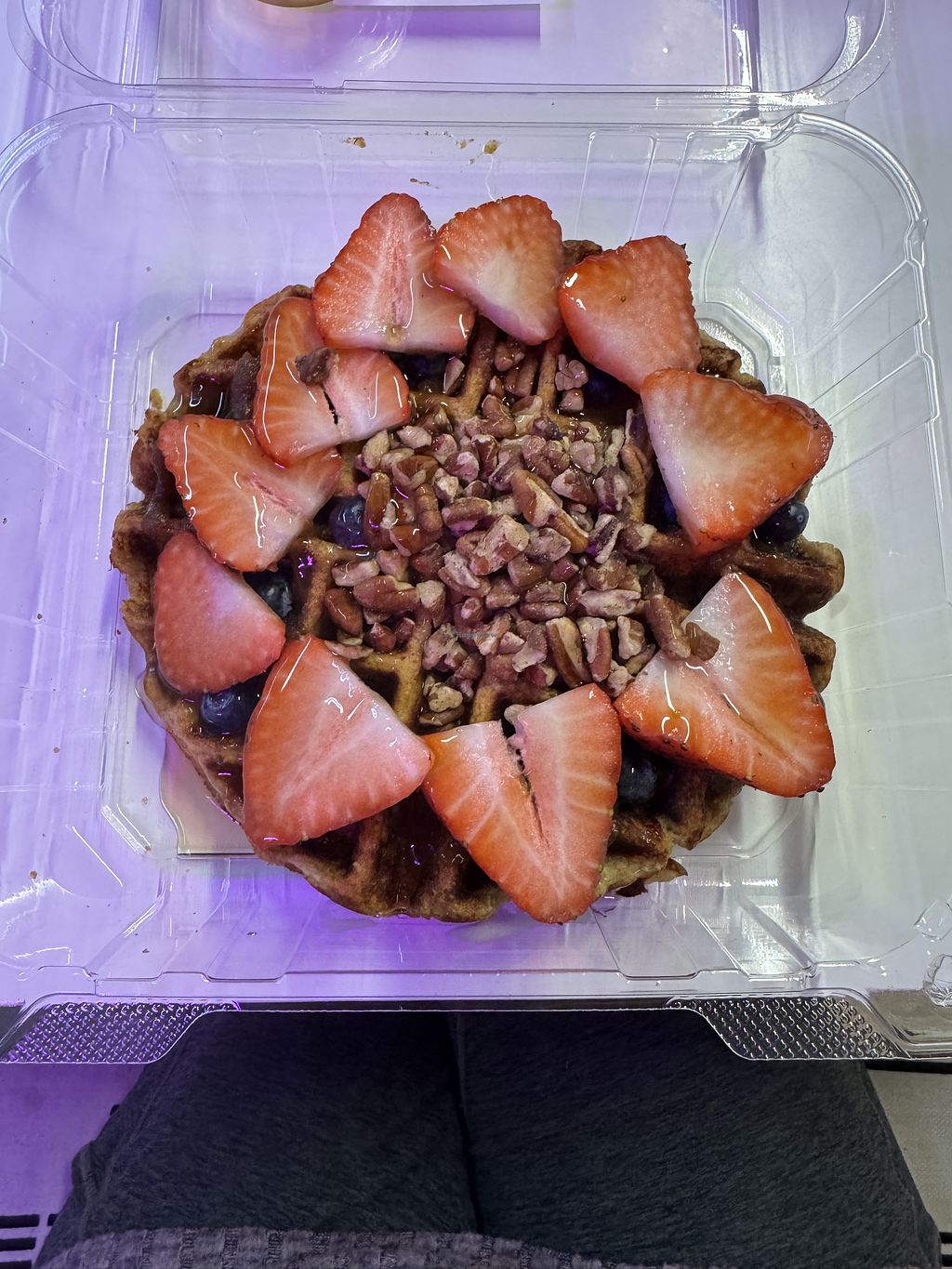 Tucked all the way in the back of the strip mall! Space is very cute. All but the waffles & protein coffee are vegan. All smoothies come with vegan protein powder added (which you can taste- if you don’t want a protein smoothie you should do a diy bowl!)