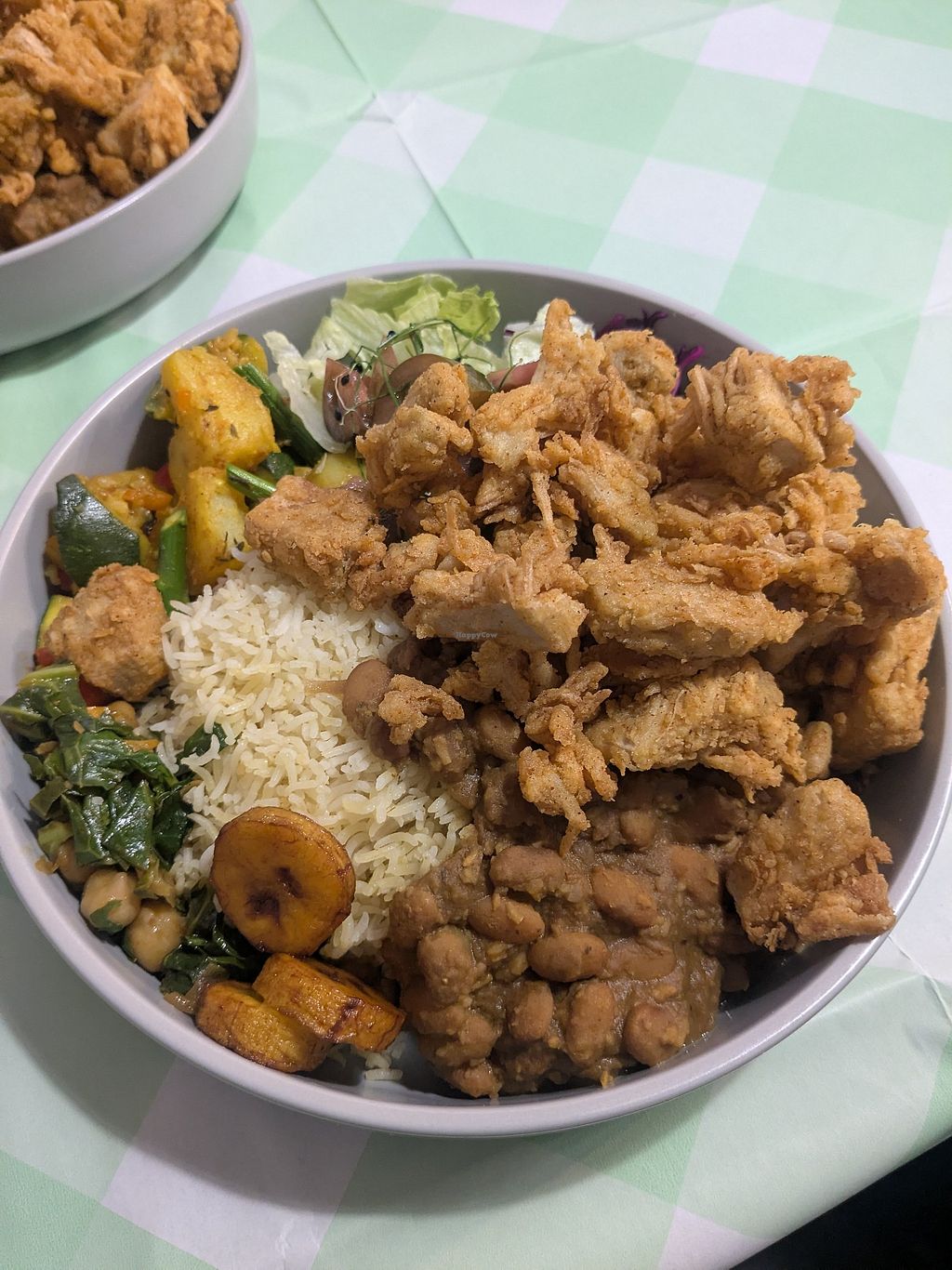Fritters, dumplings, southern fried jackfruit, coleslaw and rice