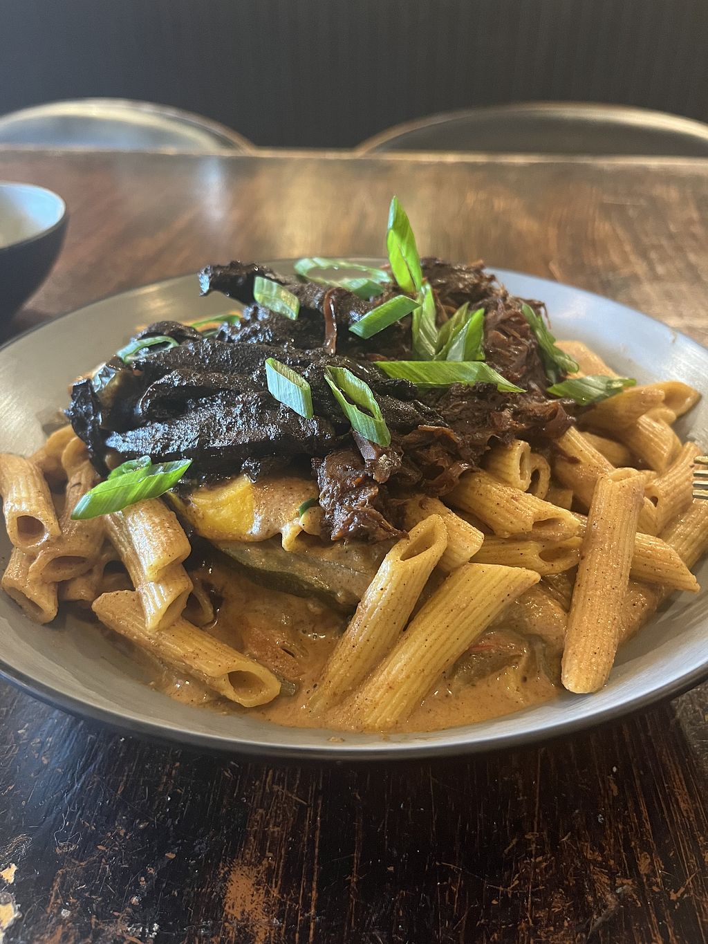 Brown stew. Spinach. Gf Mac n chz