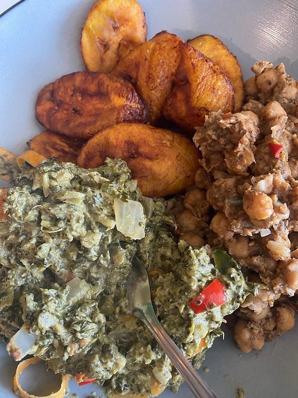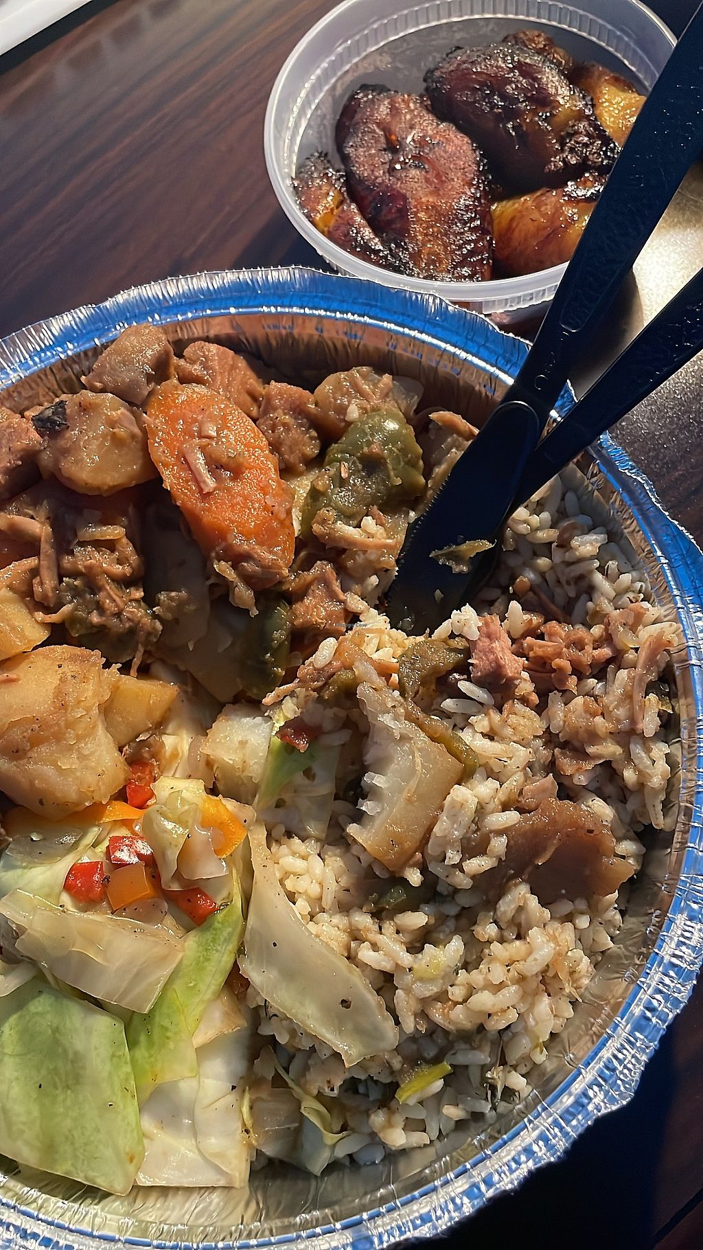 Brown stewed jackfruit, rice and peas, cabbage and plantains