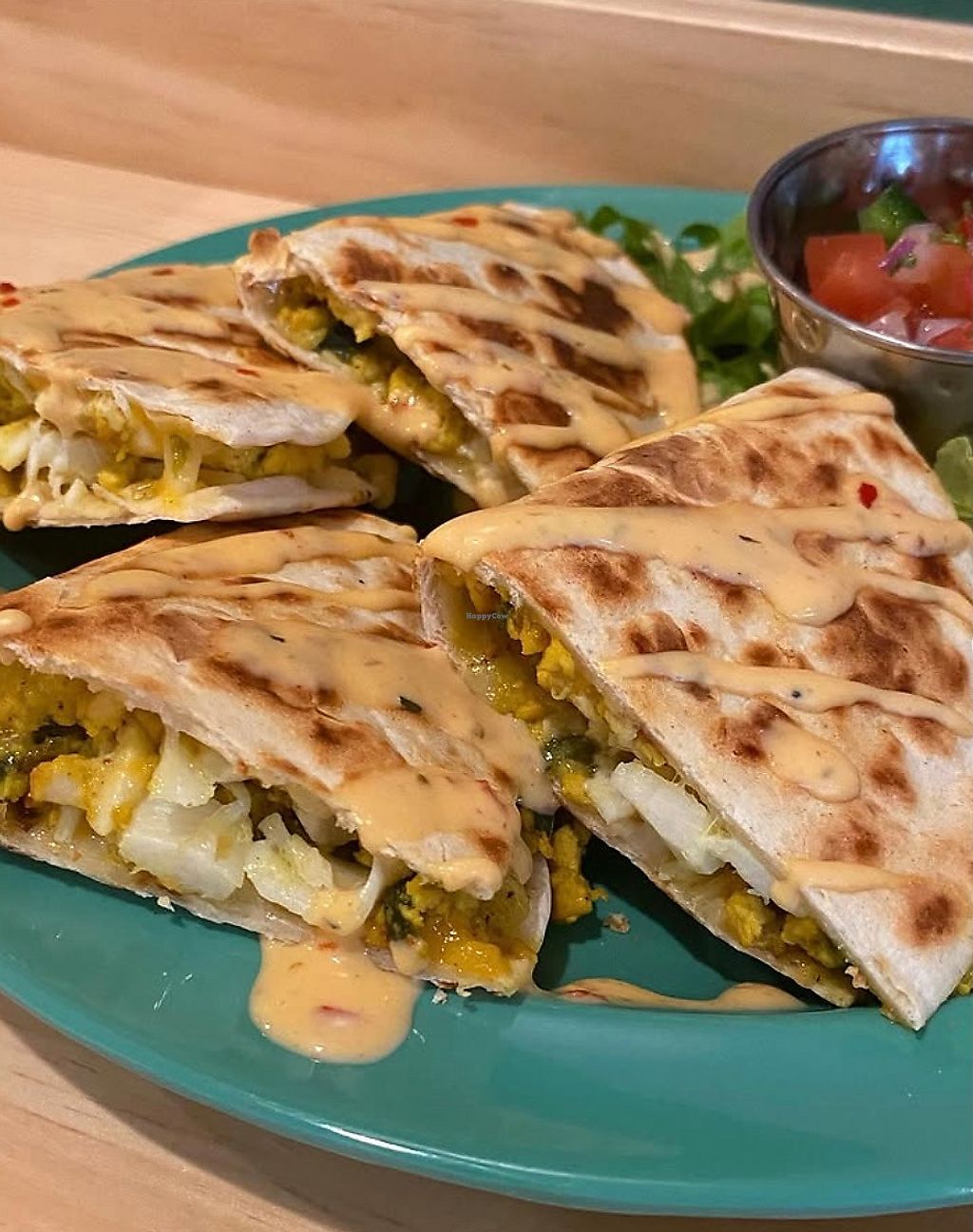Chronic Crab and Egg Quesadilla, with tofu scramble, hearts of palm, M…