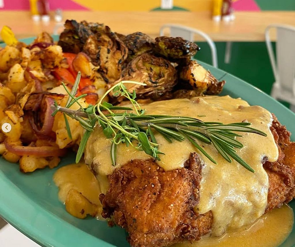 Vegan Chicken Fried Tofu with gravy, smashed red potatoes with peppers…