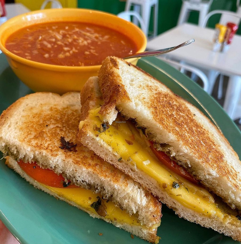 Gouda, provolone, and pesto grilled cheese with tomato soup (Vegan)
