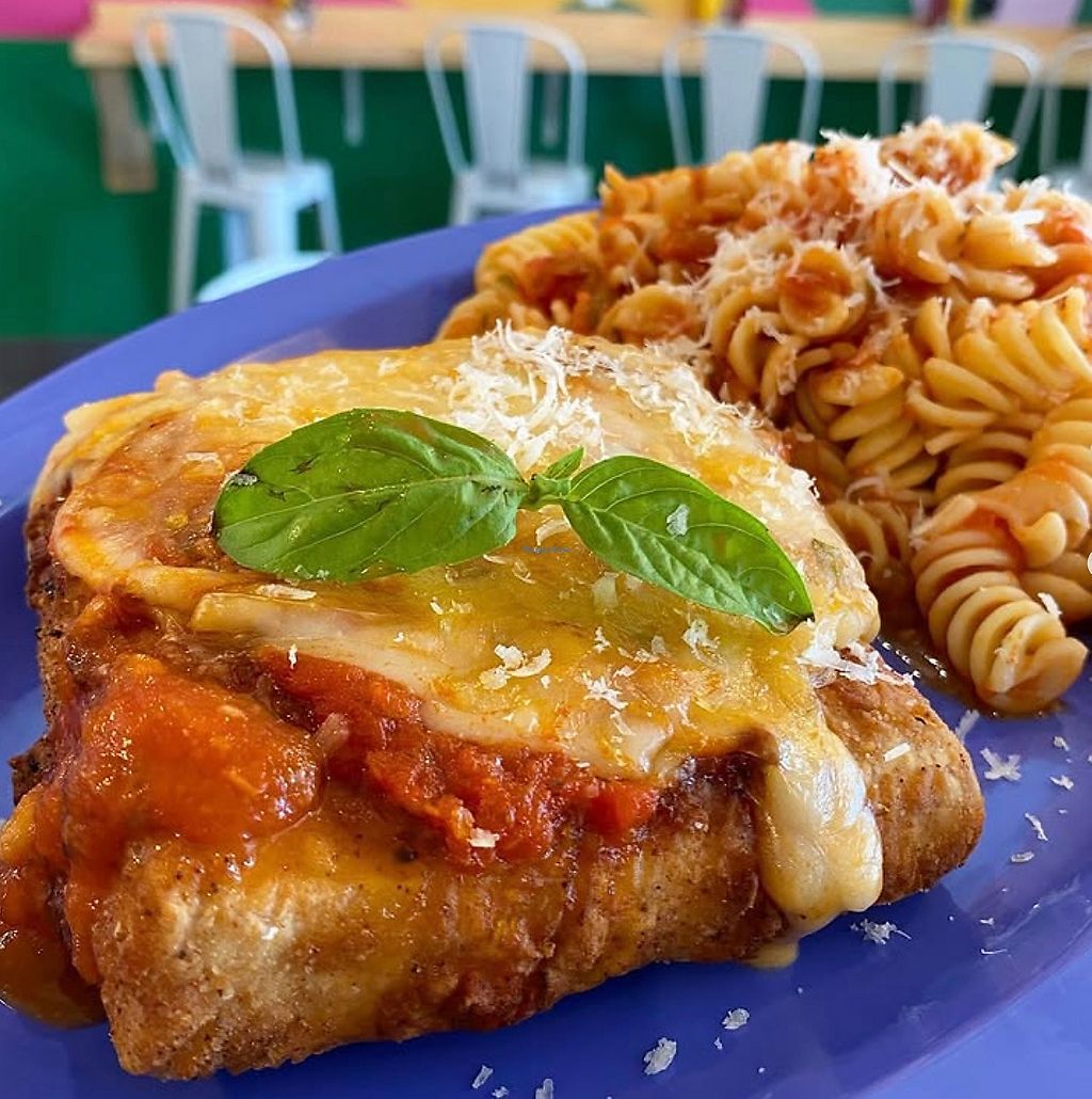 Tofu Parmesan with fried Twin Oaks tofu, marinara sauce, feta, mozzare…