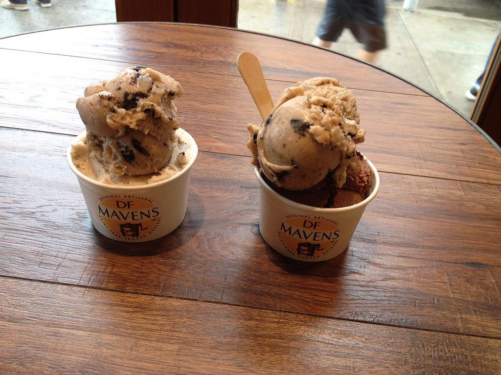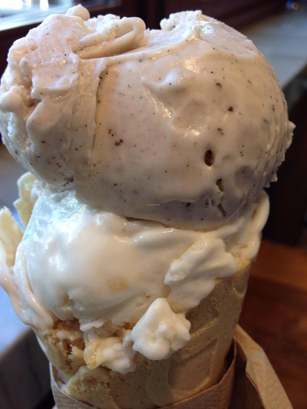 chocolate almond, strawberry champagne on a pumpkin spice cone