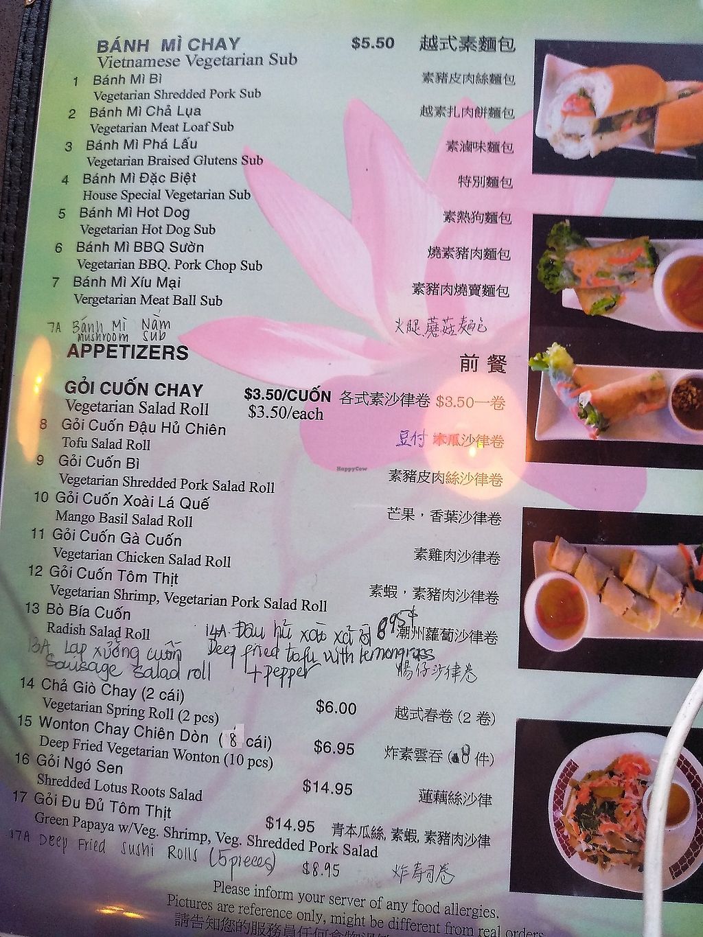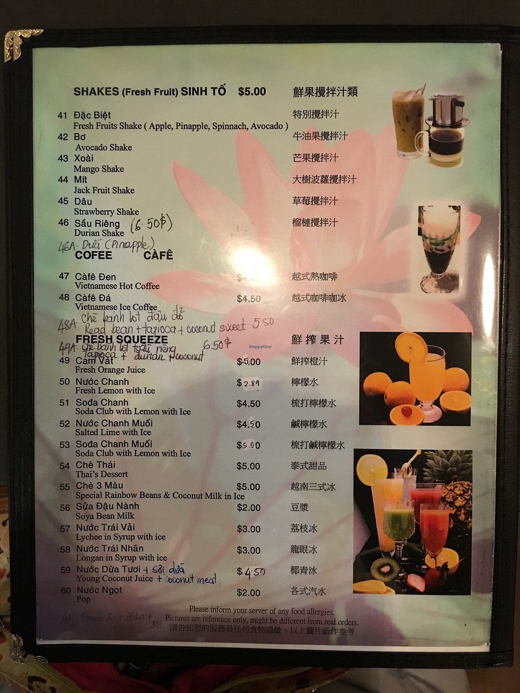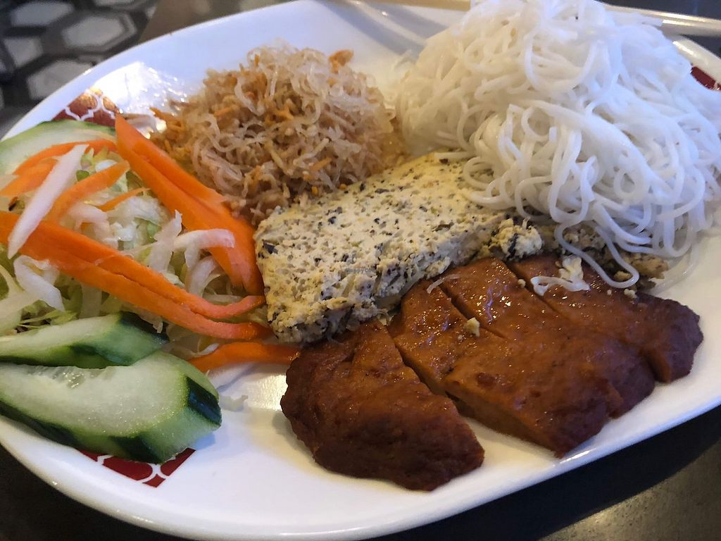 Vietnamese vegetarian restaurant and sister branch to Dharma Garden Veggie Deli in East Vancouver. Several vegan dishes available. Meatless meats including shredded pork, lemon grass chicken, and barbecue duck included in the rice, noodle or soup dishes are said to be vegan. Dairy is in most of the specialty drinks, no milk alternatives available. 15% happy hour discount offered daily from 2:30-5:30pm. Reported closed November 2021.