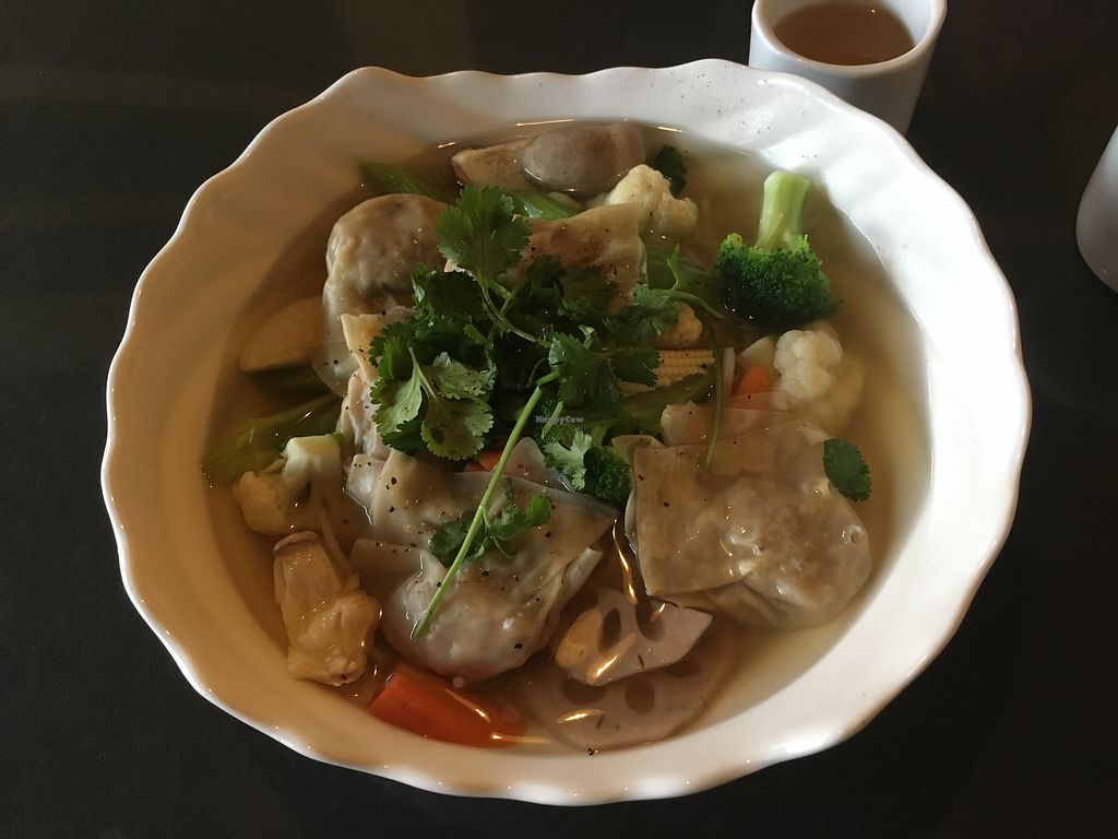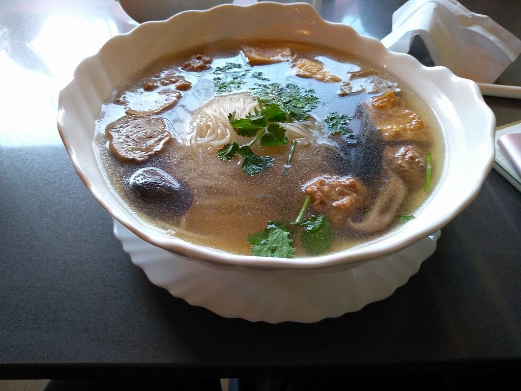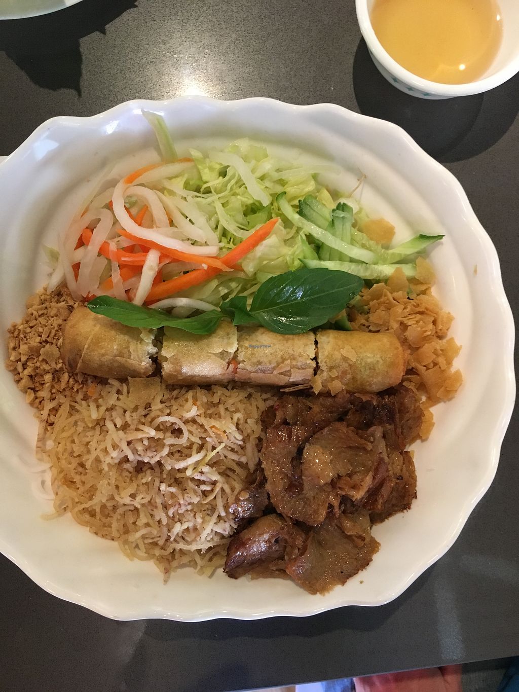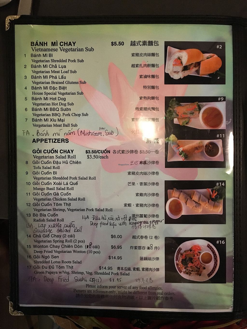 Vietnamese vegetarian restaurant and sister branch to Dharma Garden Veggie Deli in East Vancouver. Several vegan dishes available. Meatless meats including shredded pork, lemon grass chicken, and barbecue duck included in the rice, noodle or soup dishes are said to be vegan. Dairy is in most of the specialty drinks, no milk alternatives available. 15% happy hour discount offered daily from 2:30-5:30pm. Reported closed November 2021.