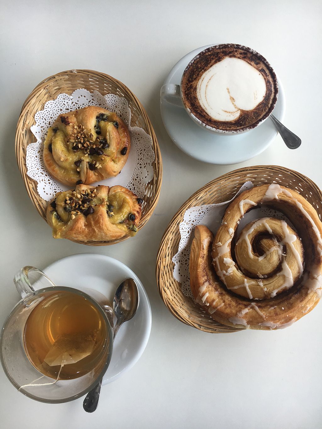 Cappuccino, tea, cinnamon roll and Danes