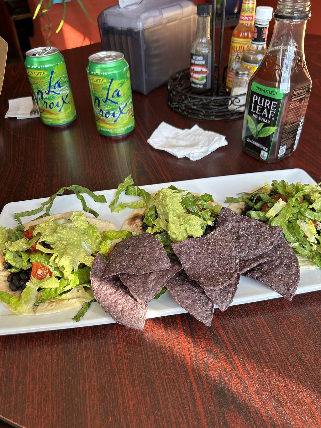 I appreciate the labeled vegan options. Having said that...the vegan tacos were not well seasoned. They also fell apart because there was too much liquid from the (beans)? Corn tortillas should be cooked to take out the raw corn flavor. Would go again for the chips and guacamole, but wouldn't order the tacos again.