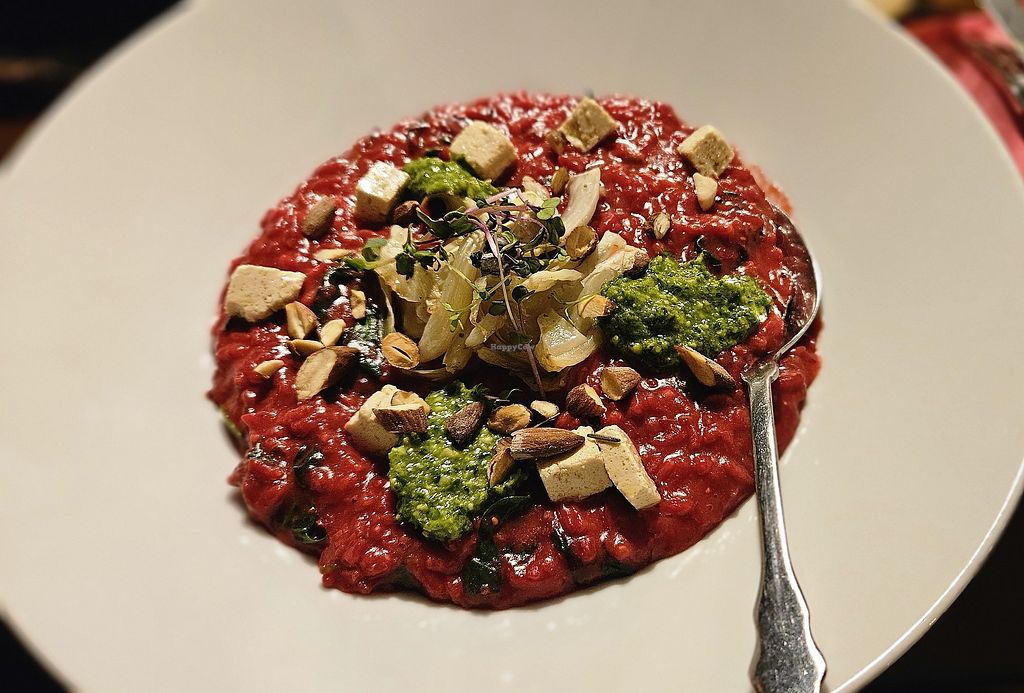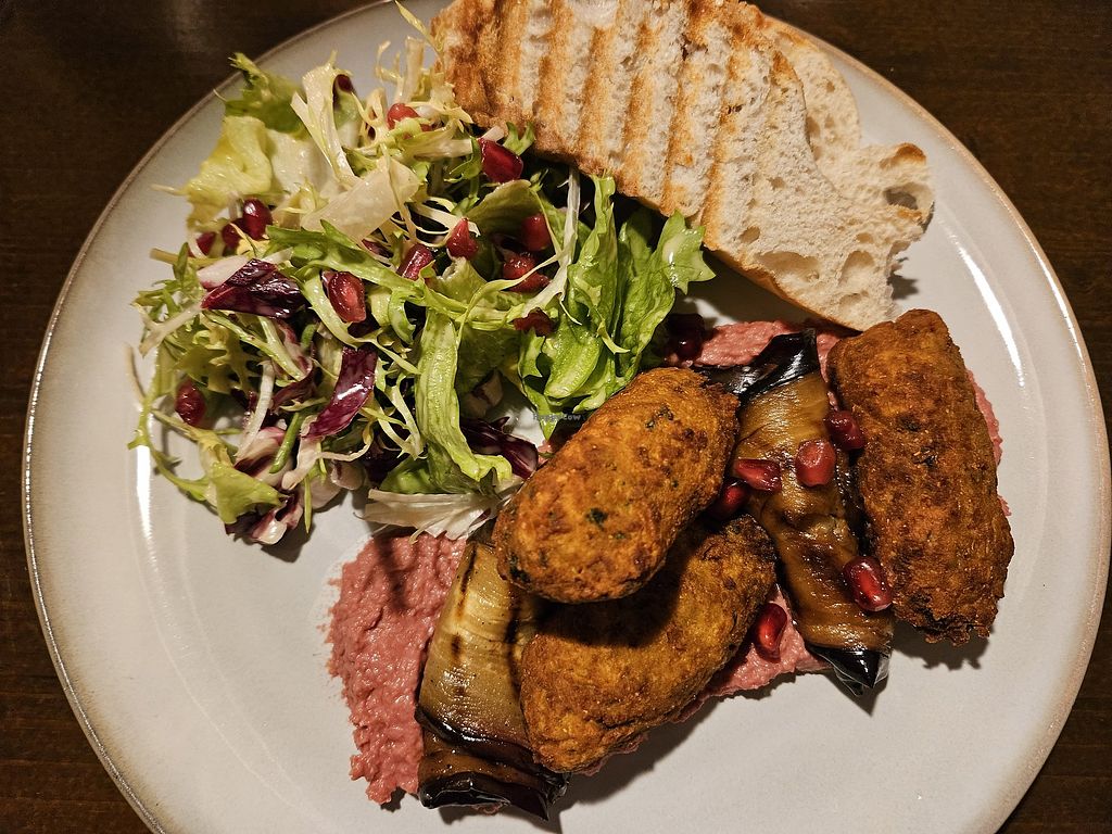 Homemade falafel with pink beetroot hummus, grilled aubergine & flatbr…