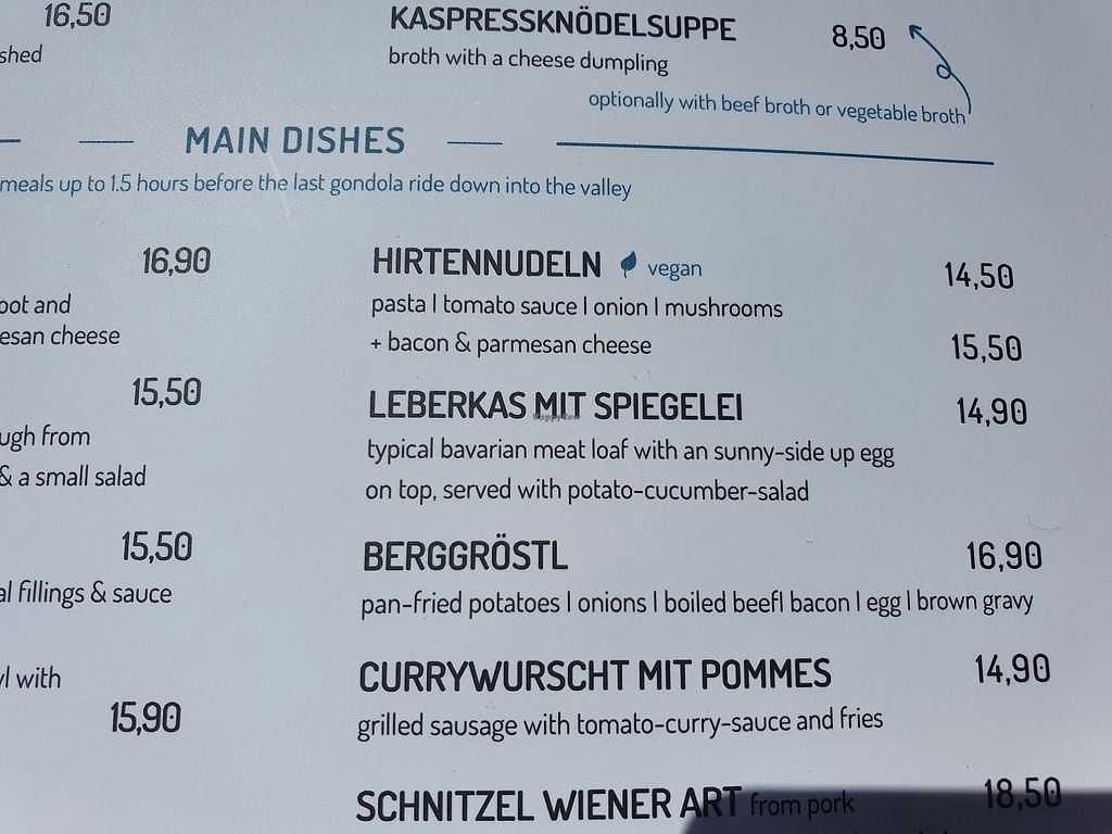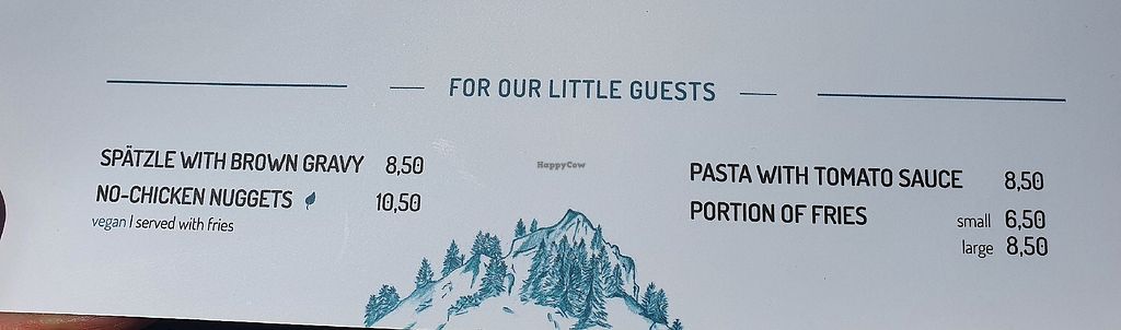 Was surprised to find clearly labelled vegan options on the menu, when usually the mountain restaurants tend to offer only traditional animal-based meals. I had the no chicken nuggets with fries from the Kids Menu, very yummy. Make sure to check the opening hours on the website, since they have different times in winter/summer.