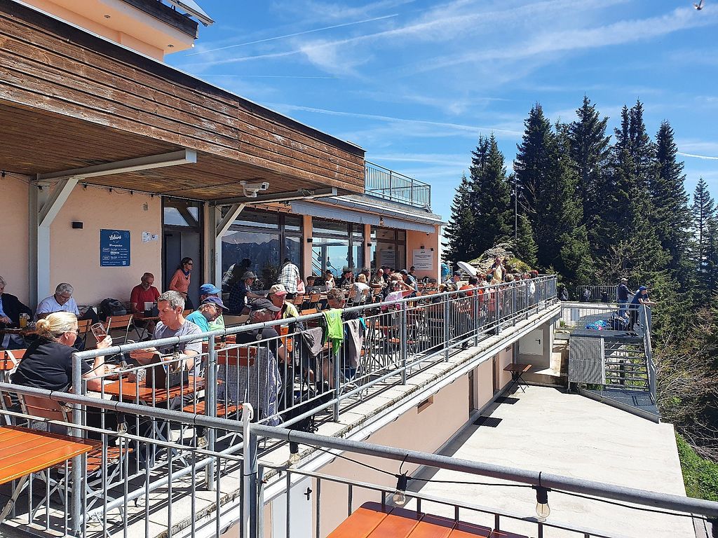 Serves meat, vegan options available. Bavarian mountain inn with panoramic views near the mountain station of the gondola. Vegetarian and veganisable options are marked. Choices include no chicken nuggets, pasta, fries, and salads. Access on foot or by gondola only. Limited options nearby. Open Mon-Sun 09:30-16:00.