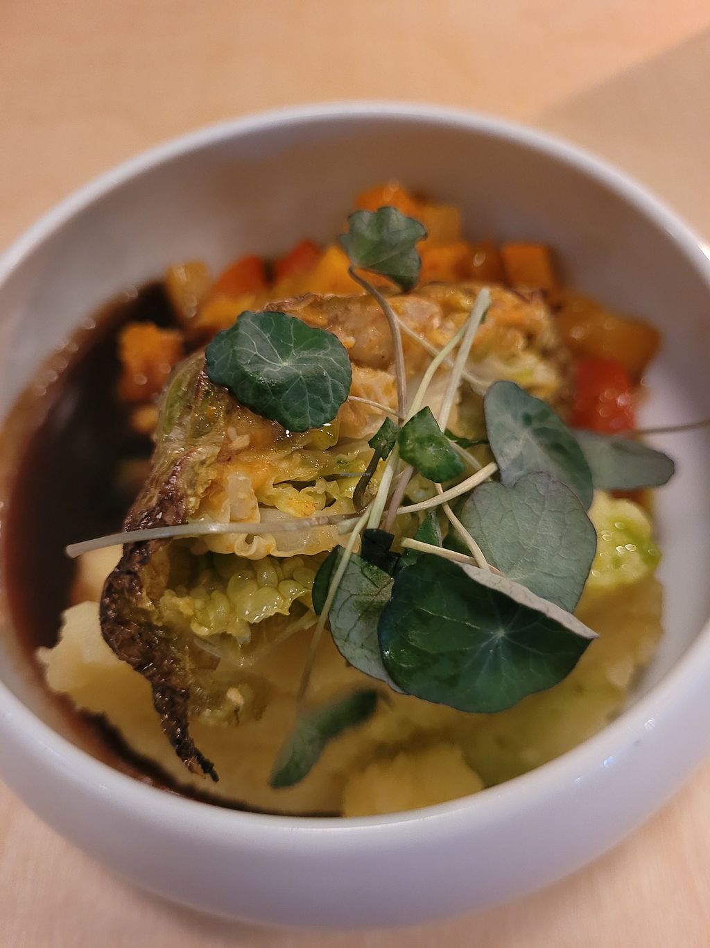 Roasted cabbage sprouts and chickpeas with mashed potatoes. #Veganuar…