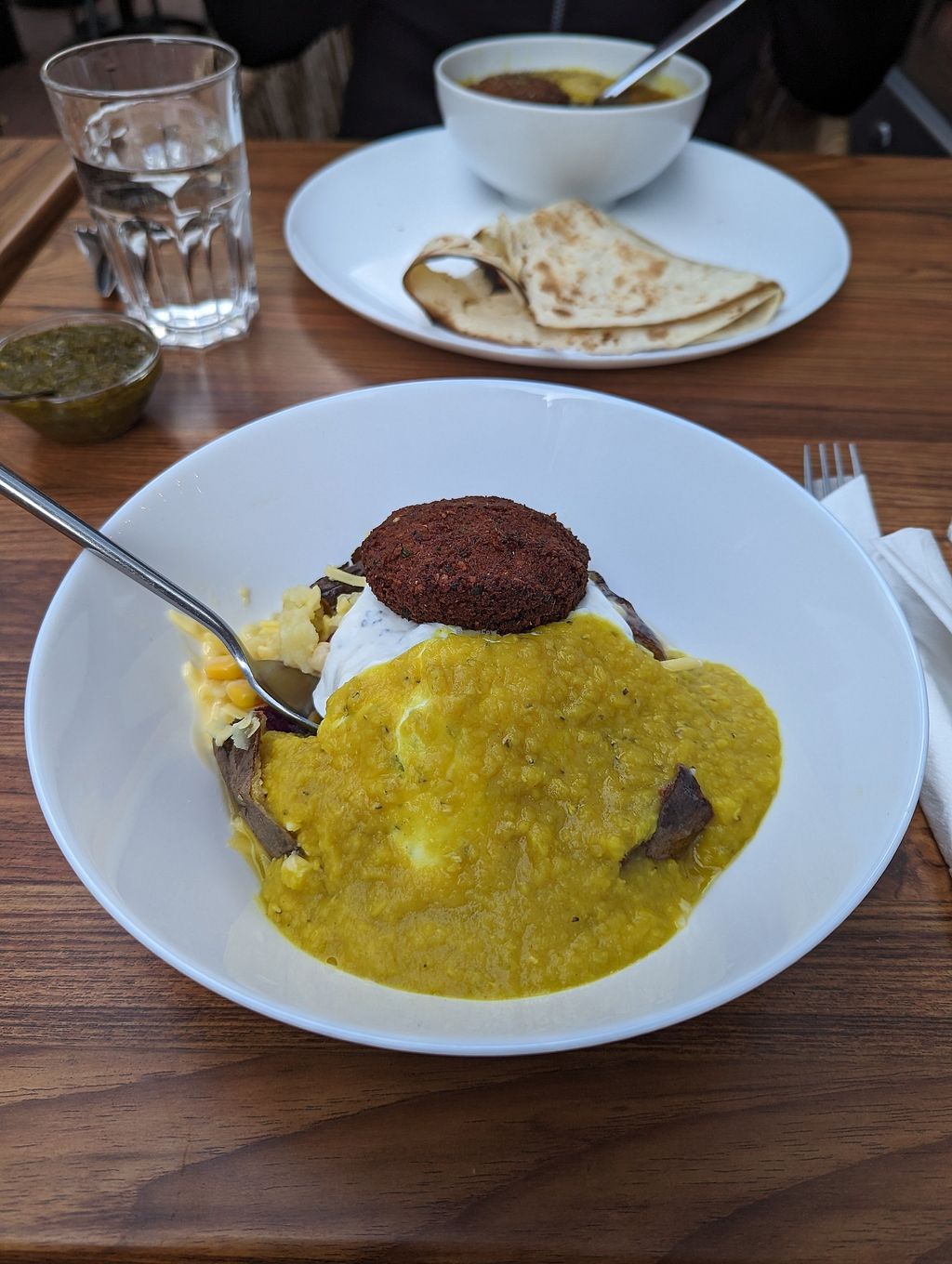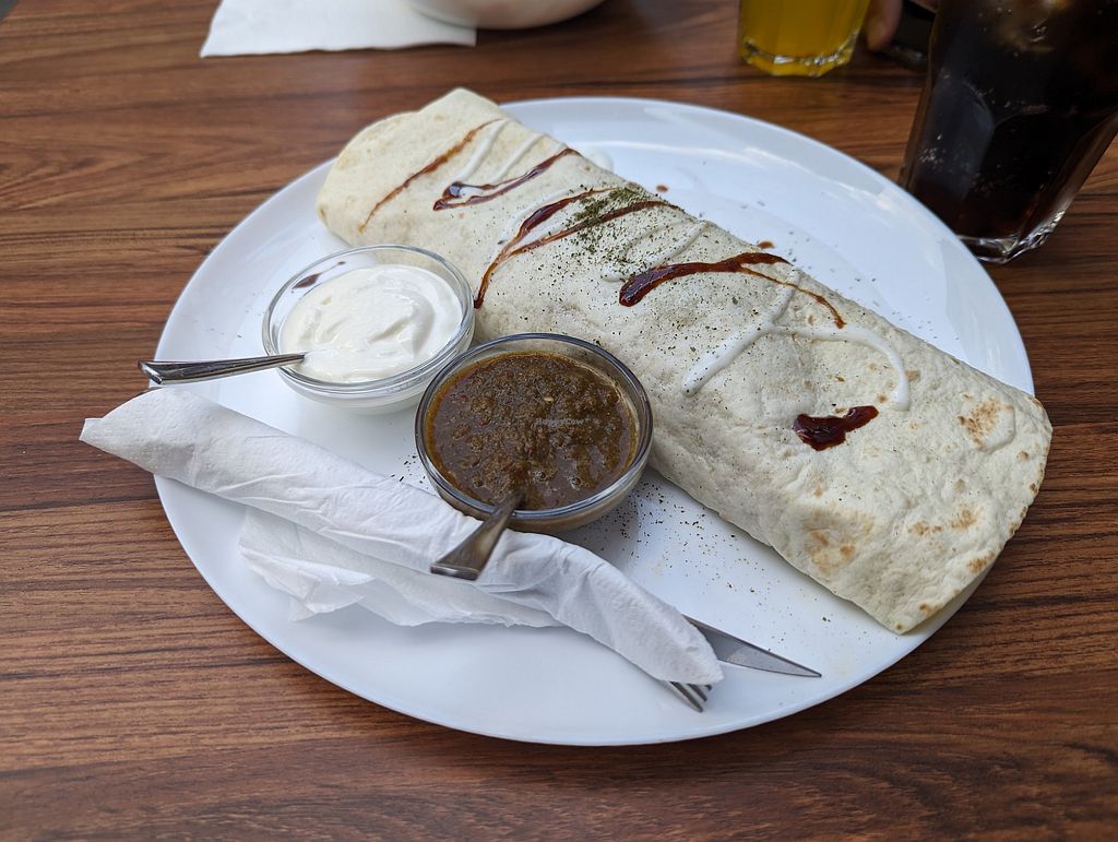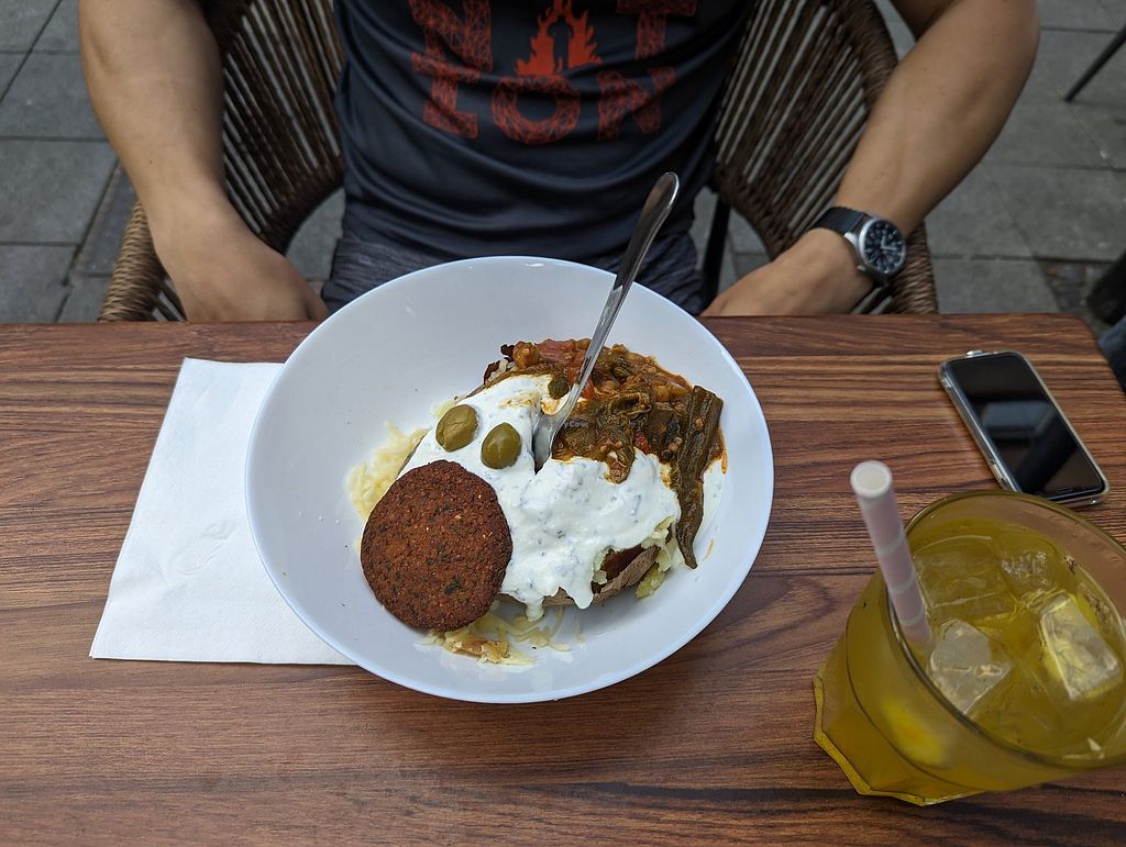 Kumpir with vegan cheese, vegan sour cream, vegan tzatziki and vegan F…