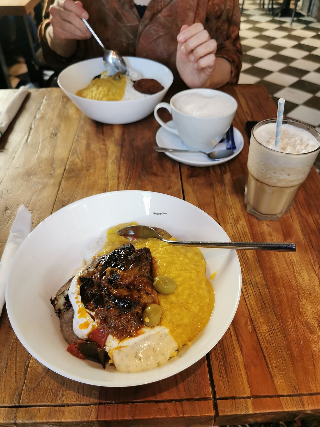 2 vegan Kumpir, one with lentil cream and aubergine, one with lentil c…