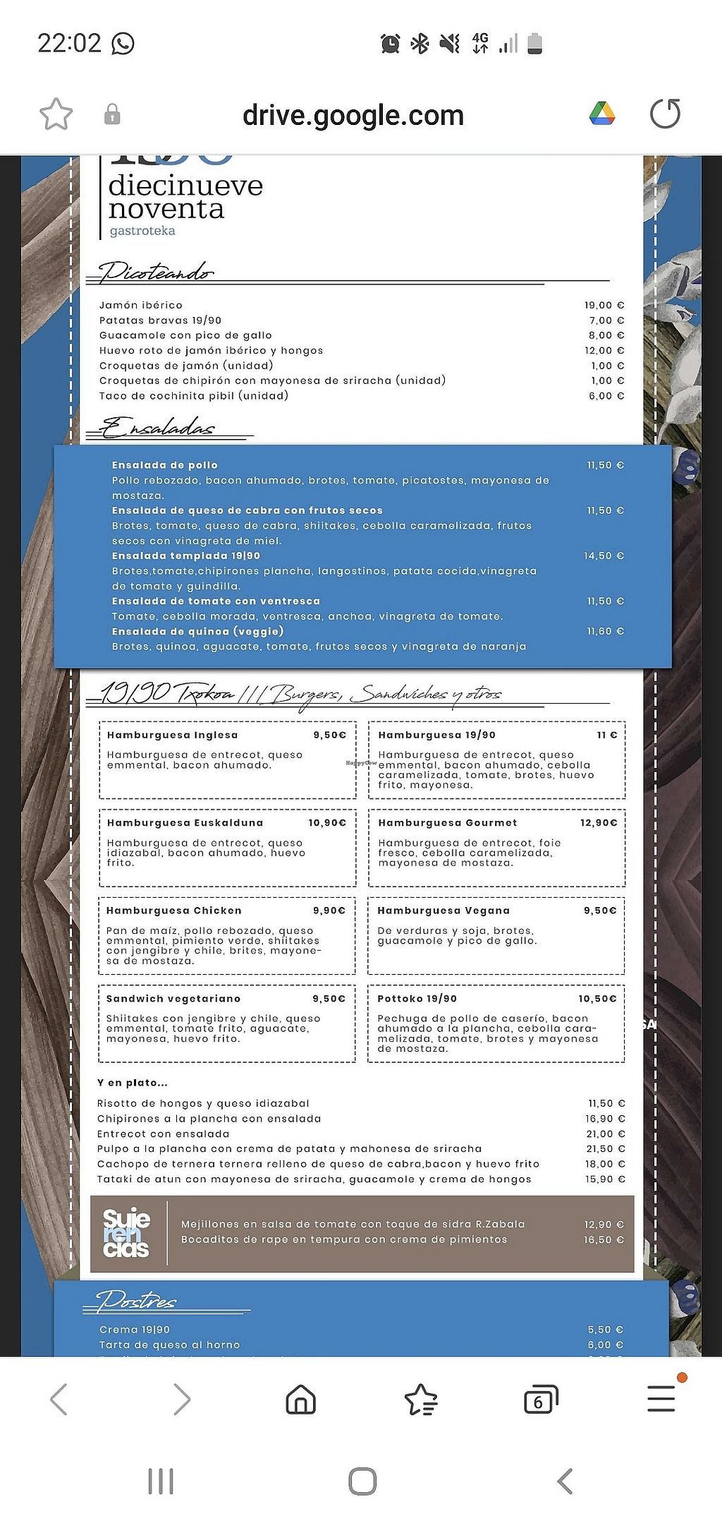 Lacto Ovo Beer/Wine Spanish Serves meat, vegan options available. Bar and cafe offering a vegan burger and a salad. Open Mon-Fri 08:30-22:00, Sat-Sun 09:00-23:00. More