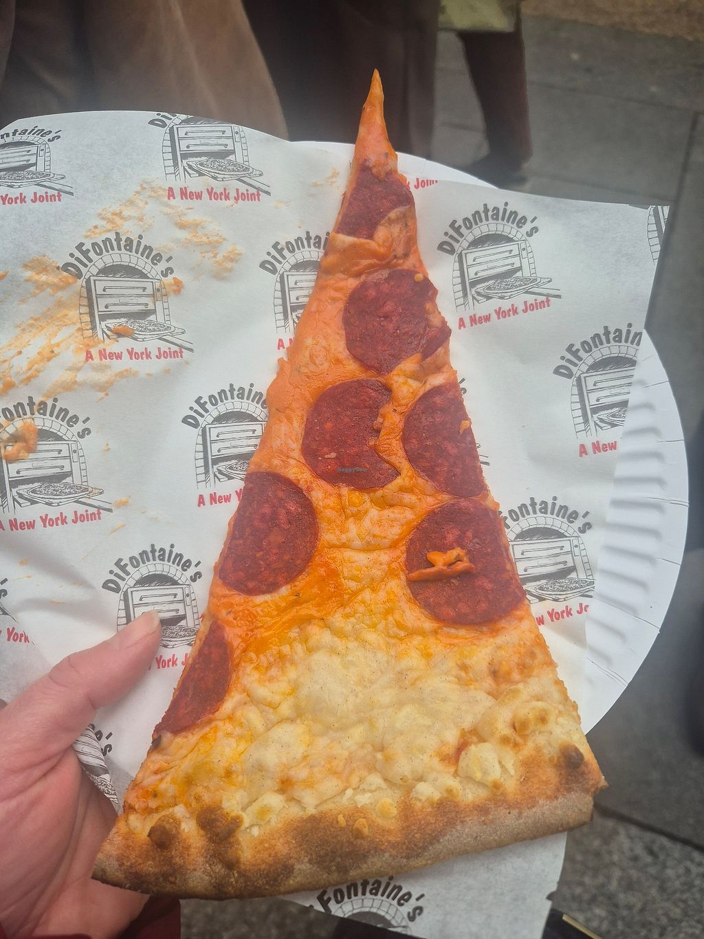 Read moreThe pizza was really good. The texture was consistent with thin sliced NY pizza, the slices were a bit larger than your average NY slice, a good "problem" to have :). It feels good in the hands to have that NY slice that you can fold in half (don't cut it with a knife and fork ... don't you dare!!! haha). The cheese had an even melt to it, this in contrast to some places that use vegan cheese shreds which gives an inconsistent look, feel and melt, but no...DiFontaine's was right on point!! Another nice added touch was the vegan mayo dipping sauce available for the crust - oh my, that was delicious!