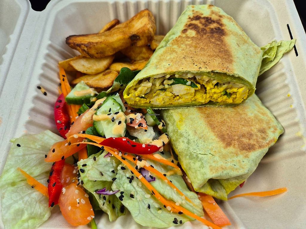 Freshly made scrambled tofu wrap which was good, while it was being made it smelt so good like spices were being toasted, but I couldn't really taste that. Also I couldn't taste the mango chutney that is listed as being a component. The filling was a mix of tofu and bit of rice so was like a burrito, it was nice and filling. The wedges (not oily) and salad on the side were very good.