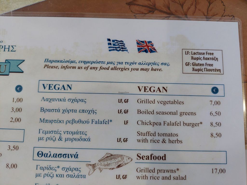 Serves meat, vegan options available. Traditional Greek restaurant offering vegan falafel gyros (omit tzatziki) and mezze. Specify vegan. Open Mon-Sun 12:00am-11:00pm.