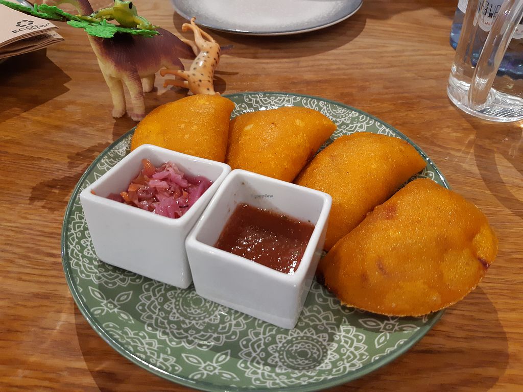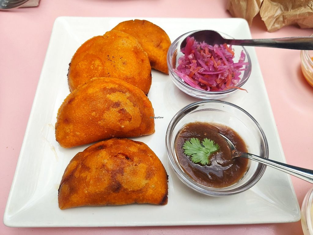 Empanadas de tofu y verduras, ensalada de encurtidos y salsa de aji