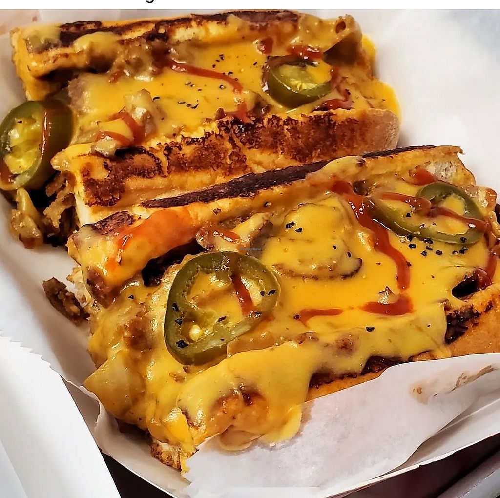 Loaded vegan Philly cheesesteak with house-made seitan steak, creamy v…