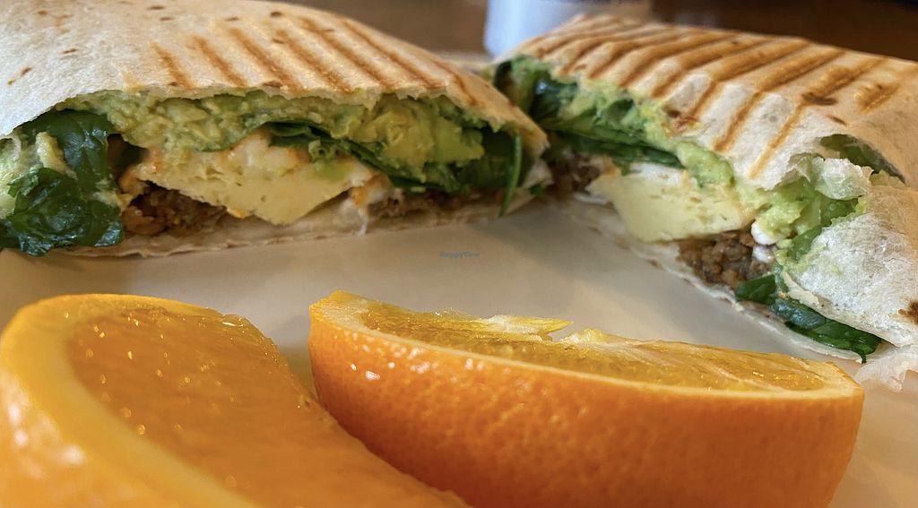 We found this amazing gem on HappyCow today and are so glad we did. I had the just egg wrap special with spinach, sausage, feta, avocado, and homemade chipotle mayo (yes, all vegan). It was incredible. Also, we loved the decor. Super cute and welcoming!
