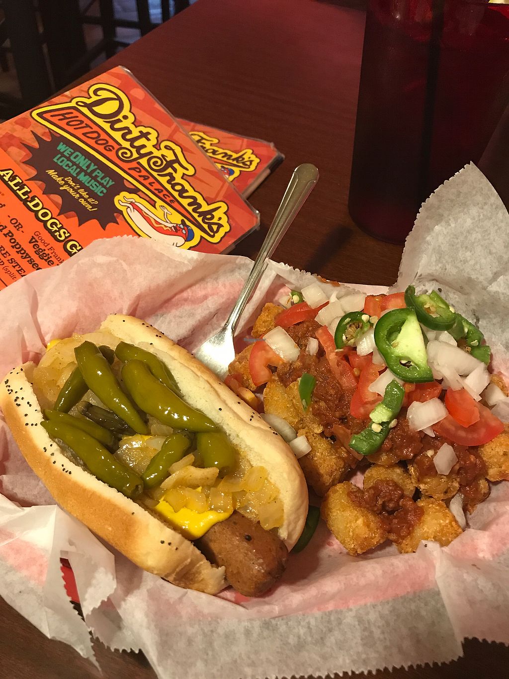 One of the many vegan hotdog options at Dirty Frank's along with vegan…
