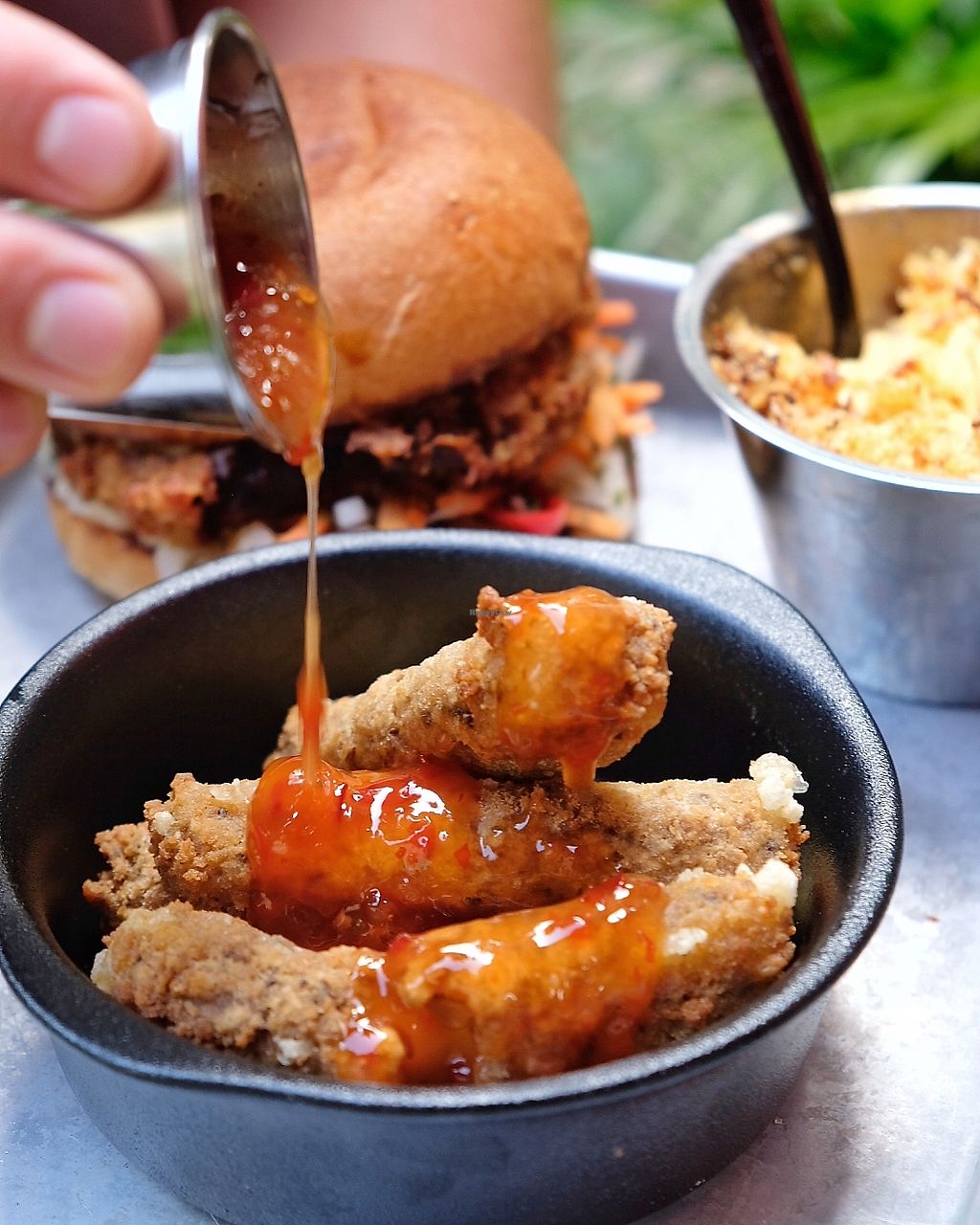 Popcorn Chick'n (with green sprig), Cheez Sticks (left) and Buffalo Wi…