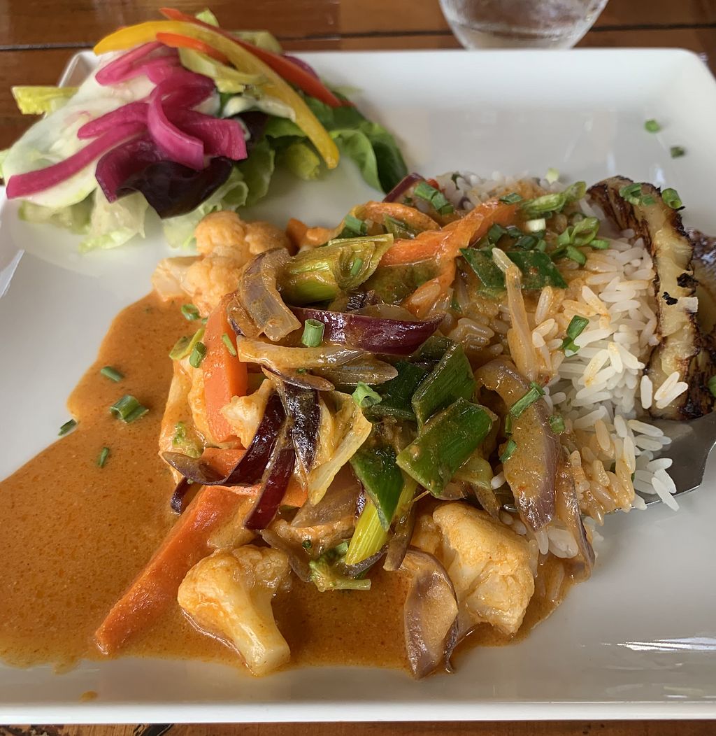 Some vegan options. The service is nice. Good ambiance . I took the Carabean curry and it was very good.