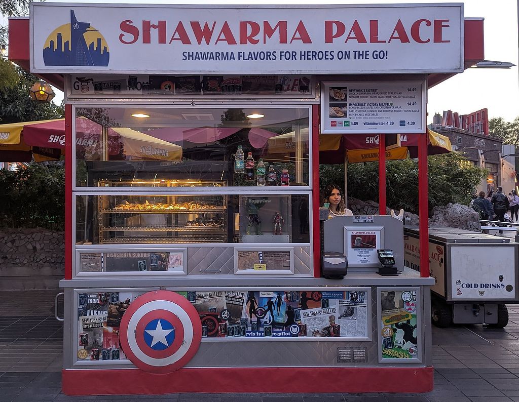 It’s not clear in this listing, but just so everyone knows: there are TWO Shawarma Palace carts in Avengers Campus. One is located just past the main entrance to the campus, near the other restaurants in the quad area. The other one, called “Shawarma Palace Too: At Hyperion” is located near the secondary entrance to the campus coming from Hollywood Land. I’ll post photos.