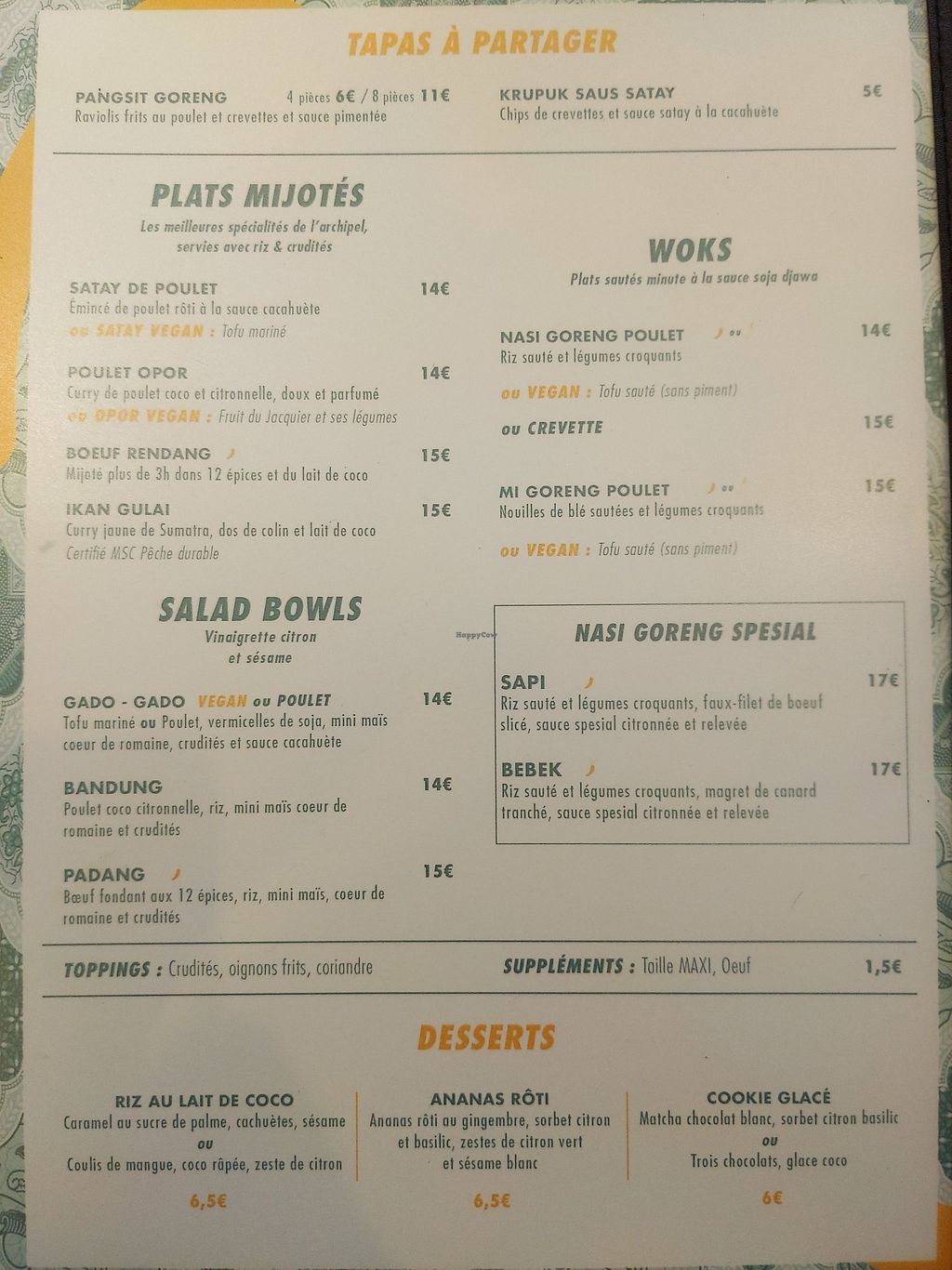 Serves meat, vegan options available. Casual eateries offering Indonesian food. Vegans can have tofu satay w/ peanut sauce, white rice and vegetables, javanese jackfruit curry, gado-gado salad, or a fried rice and fried noodles with tofu. The dessert coconut milk soup w/ banana and fresh fruit is vegan, but the chocamole contains dairy. Reported closed November 2023.