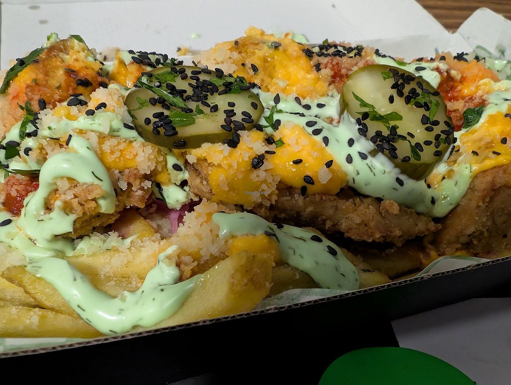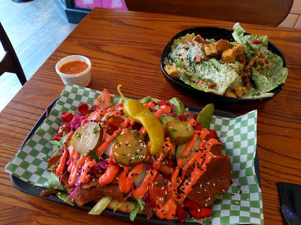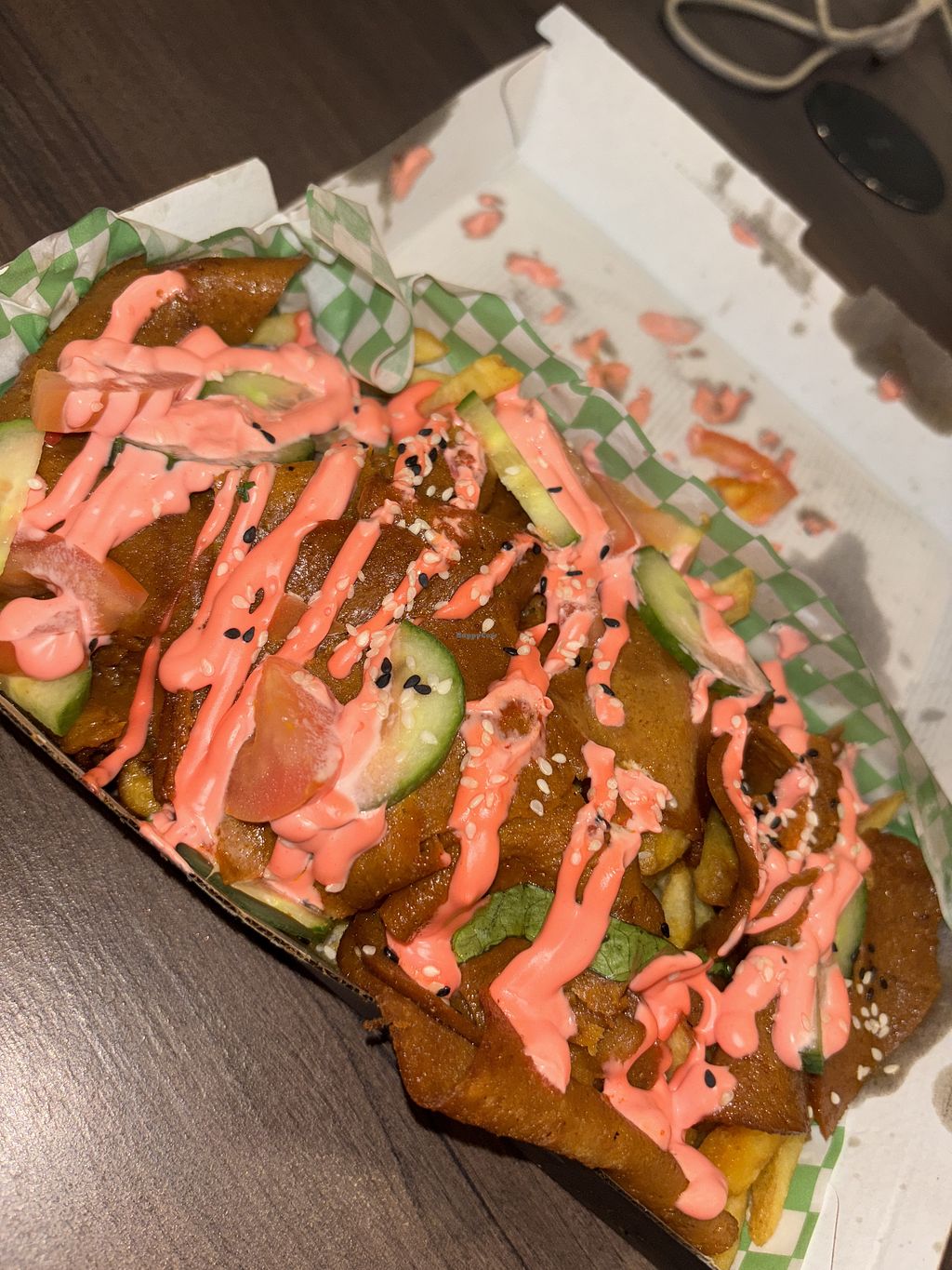 We had a doner on fries and a crispy ‘chicken’ on fries. Portions substantial and both delicious. Highly recommend.