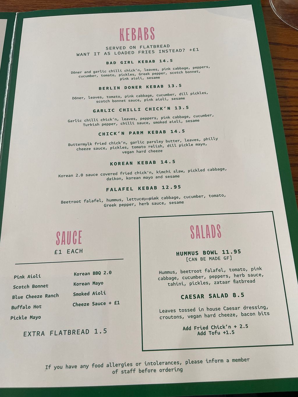 Really delicious food - went for the bad girl kebab and the garlic and parmesan tots. However the highlight of the evening were the delightfully refreshing Garden of Vegan cocktails!