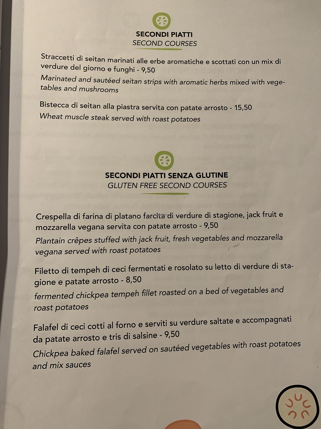 All vegan menu with a great variety and good prices. Dishes were good, especially the primi, and well presented. Portions are small. Service not too fast and dishes need to be picked up at the counter by the customer.