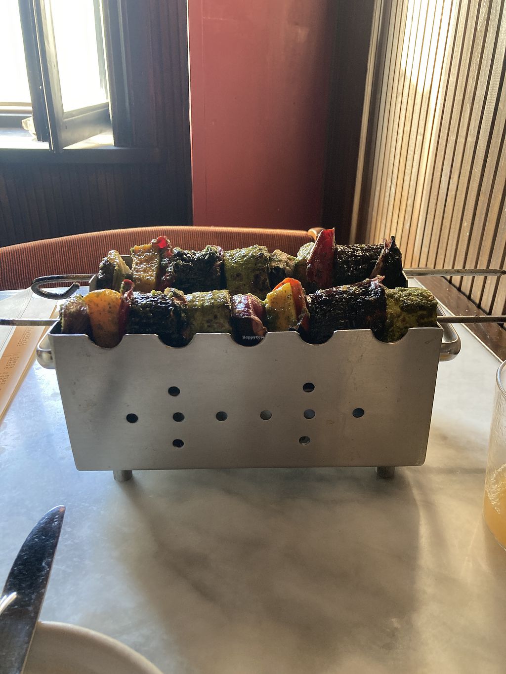 The skewers (vegetables mtsvadi) were very delicious. Staff knows what veganism means, and even saved me by double checking, because it turns out the ghomi is not vegan (contains butter). I wasn’t actively offered to have food be veganized. But also didn’t ask for it. Leaving out the Ghomi the options are a bit more limited. But overall good food. Service was also very good