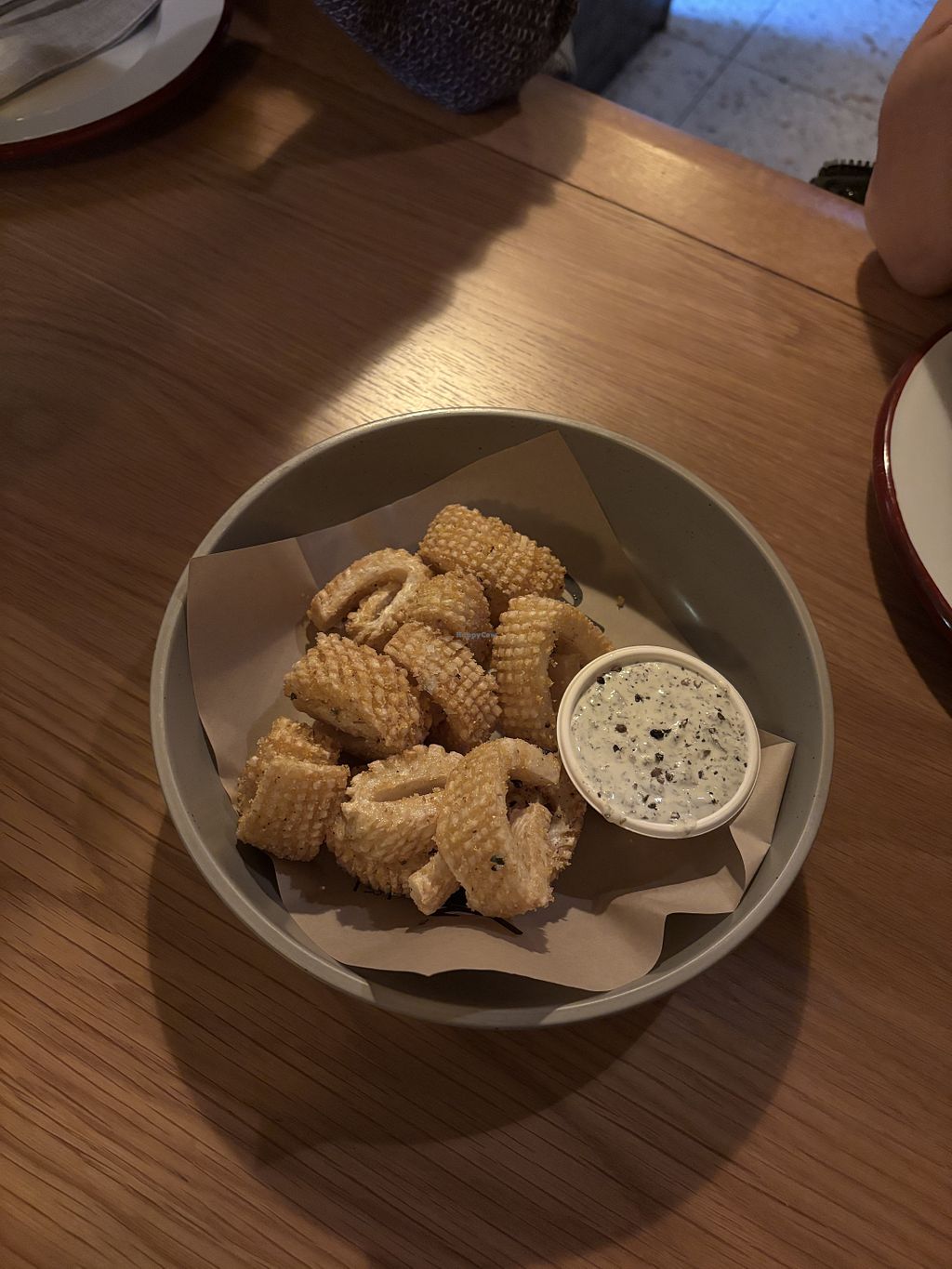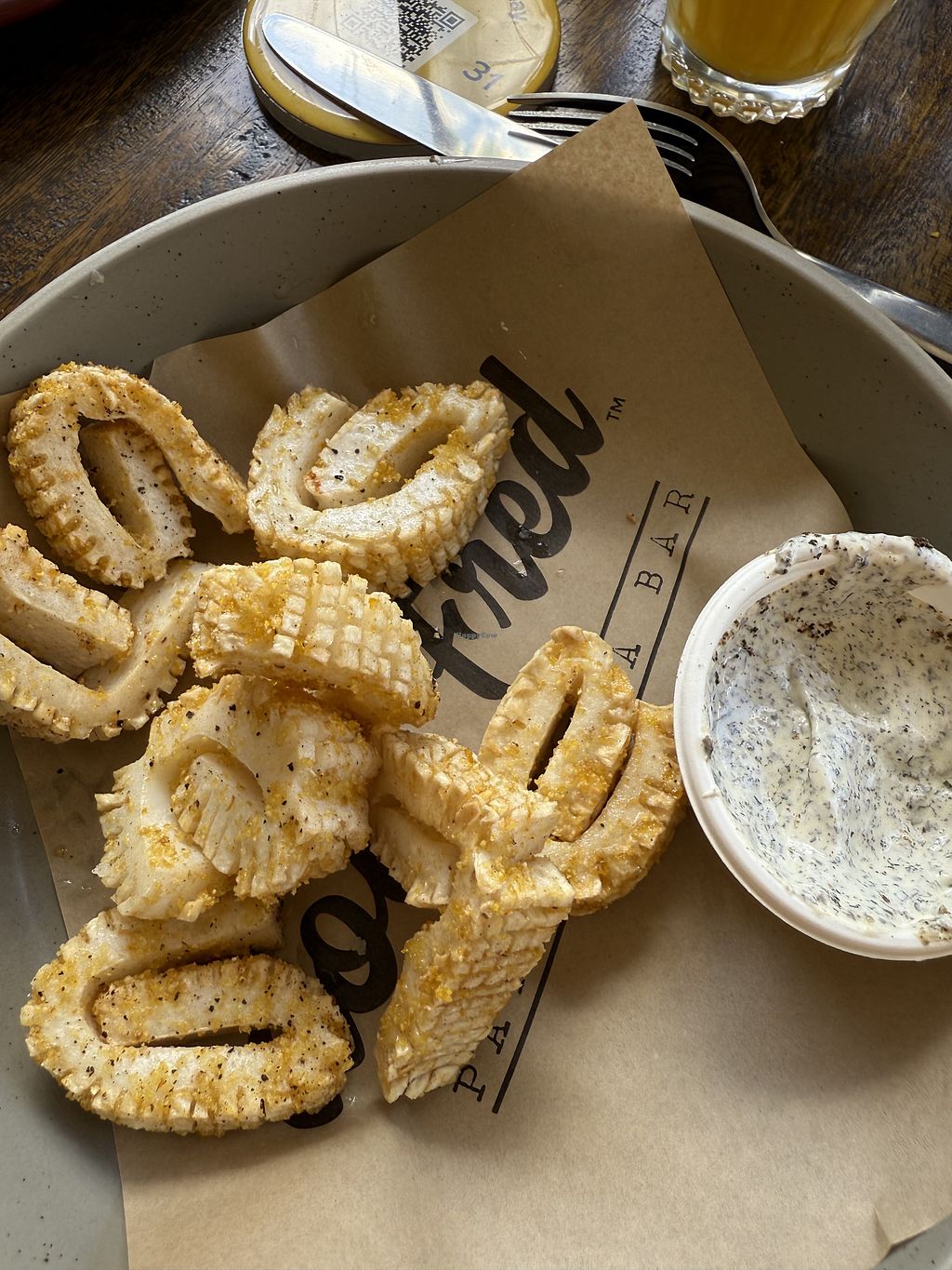 - Calamari: subtle seafood smell, great taste, feels like was breaded in couscous and fried (a bit too crispy for me though), good sauce