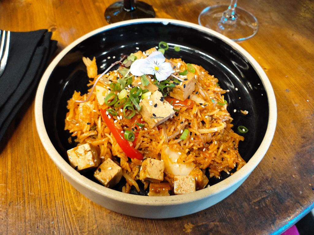 Arroz basmati picante con verduras y tofu frito