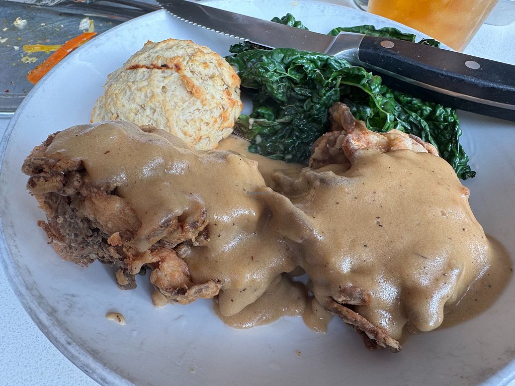 Chicken Fried Mushrooms with biscuit, gravy and greens. Perfectly, not…